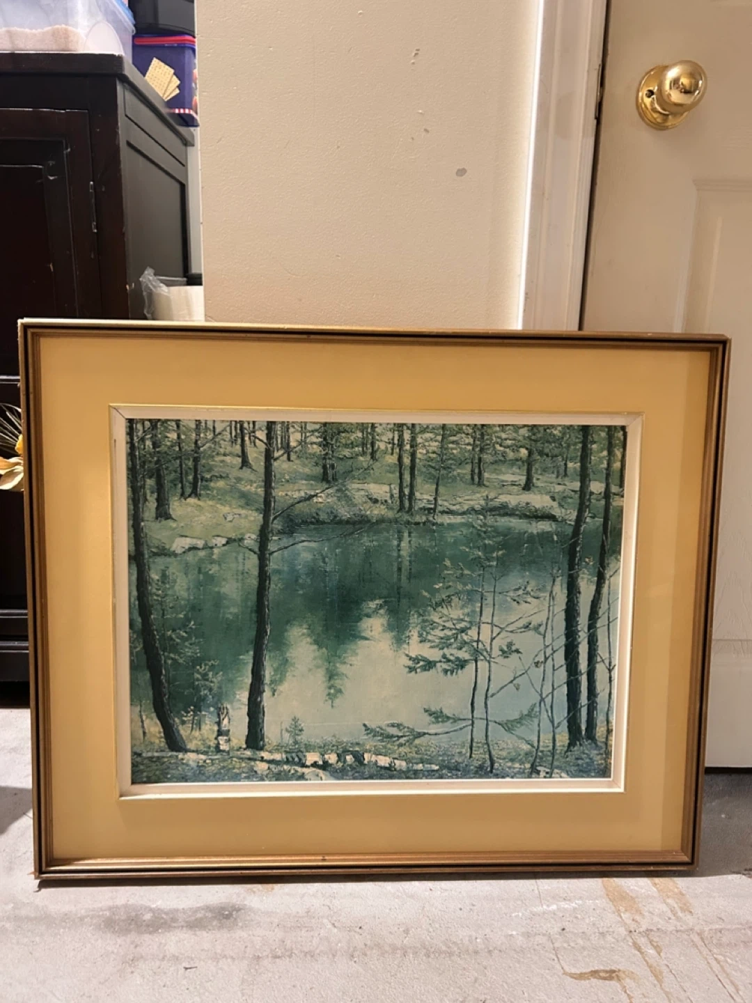 This is a framed landscape painting depicting a serene forest scene with a body of water. The artwork is matted and set in a gold-toned frame. It's a beautiful piece for any wall!