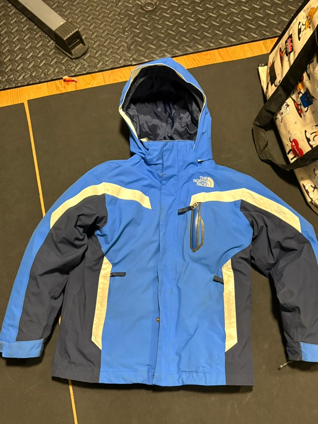The North Face 3-in-1 Triclimate jacket for boys. Features a rain guard, tunnel, chin guard, ID label, and glove clips. Includes an inner jacket and outer shell system.