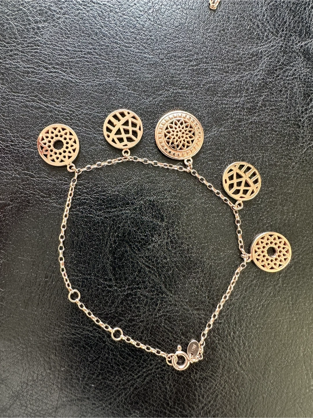 This is a beautiful rose gold bracelet from Links of London. It's in excellent condition and features a delicate chain with circular charms. The clasp is marked S925.