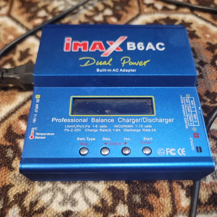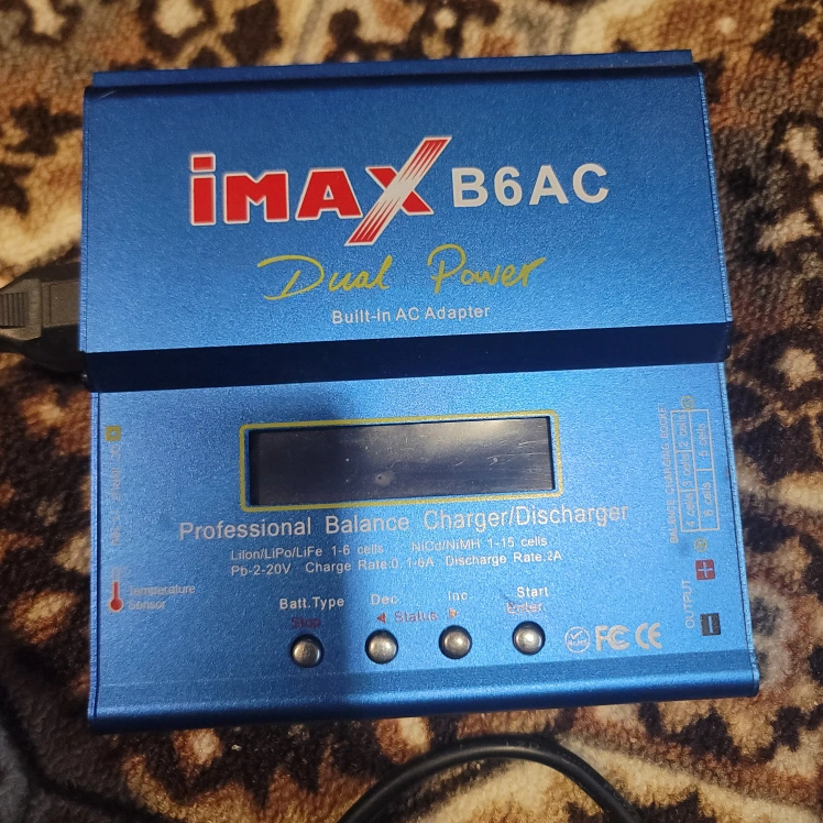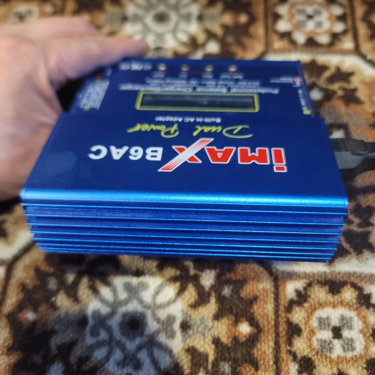 Used iMAX B6AC dual power charger/discharger. Charges LiIon/LiPo/Life 1-6 cells and NiMH/NiCd 1-15 cells. Features a built-in AC adapter. Includes power cord. Small, portable size.