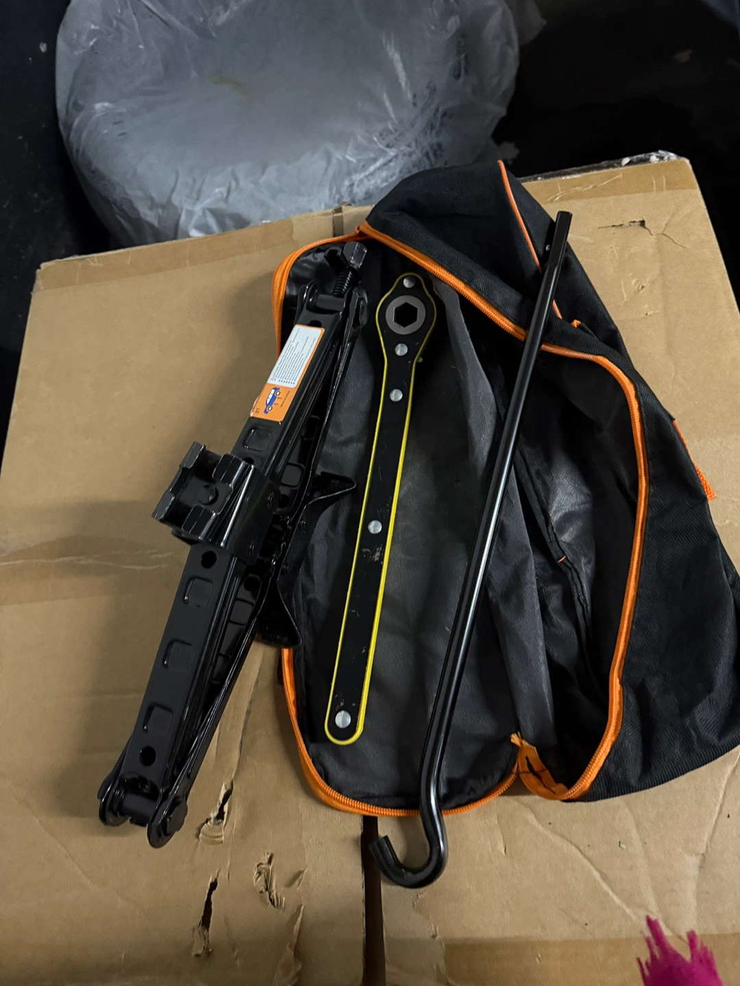 Selling a car jack with tools and a convenient carrying bag. This set includes the jack itself, a wrench, and a rod, all neatly packed in a black and orange bag. Perfect for roadside emergencies or routine maintenance