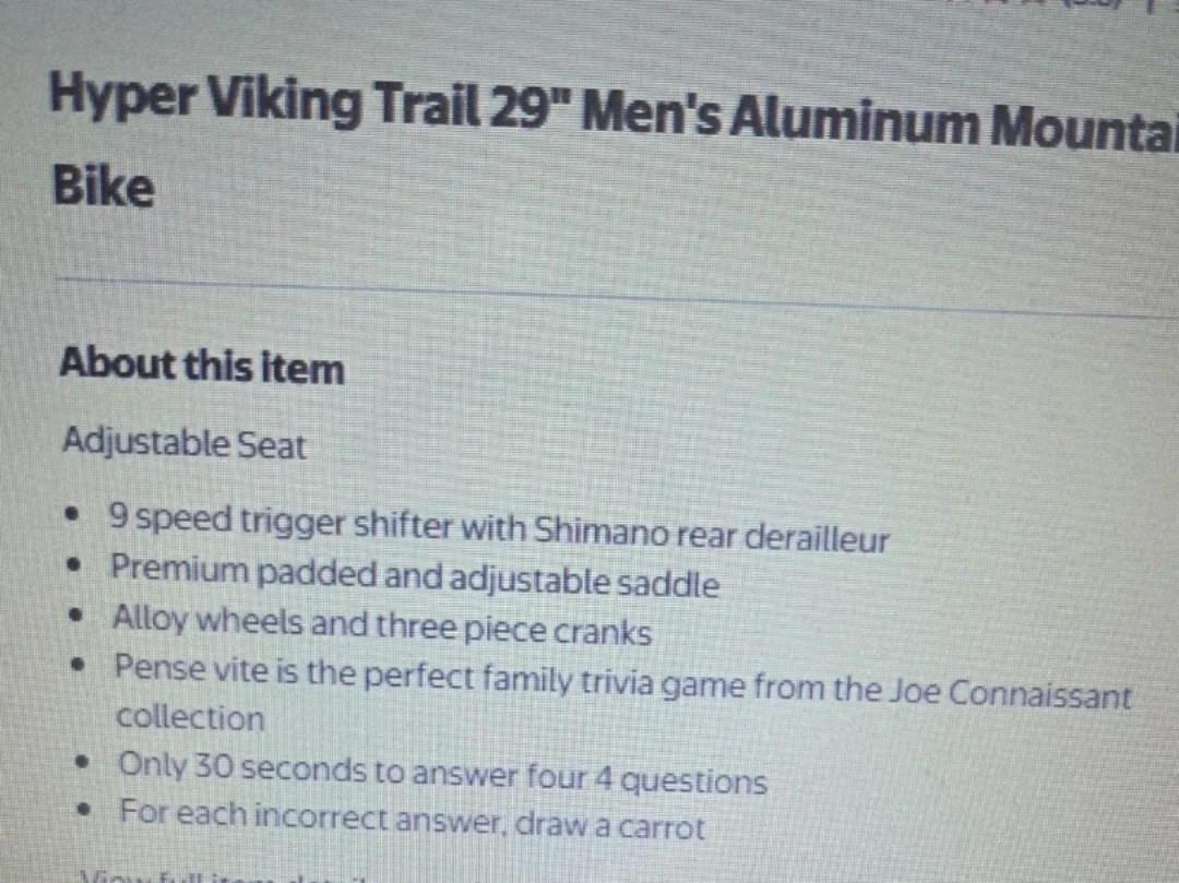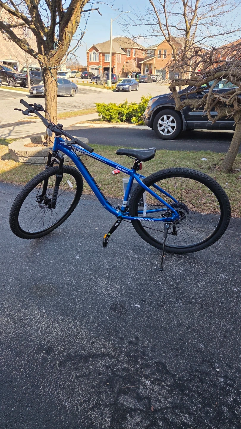 Blue aluminum frame mountain bike with 29-inch wheels. Features a 9-speed trigger shifter with Shimano rear derailleur and alloy wheels. It has a premium padded and adjustable saddle. This bike is perfect for hitting the trails!