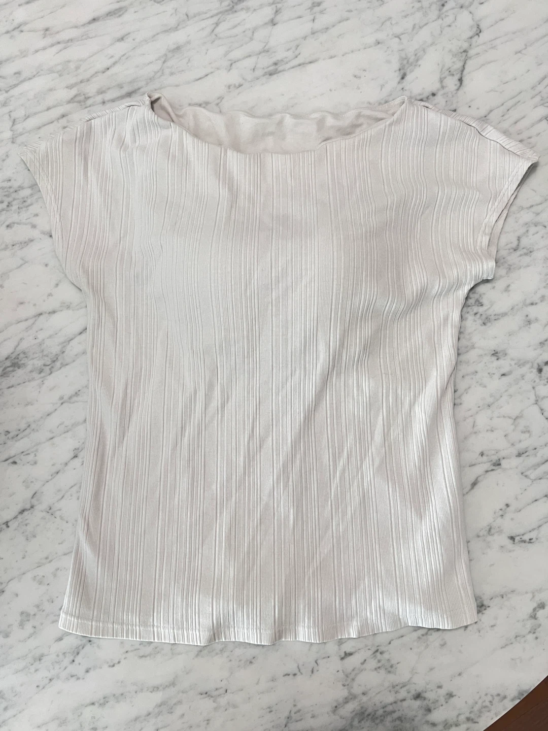 UNIQLO ribbed t-shirt in off-white. Size S, fits bust 77-83 cm. Shell is 94% cotton and 6% spandex. Lining is 95% cotton and 5% spandex. It's a comfy, textured tee perfect for layering or wearing on its own!