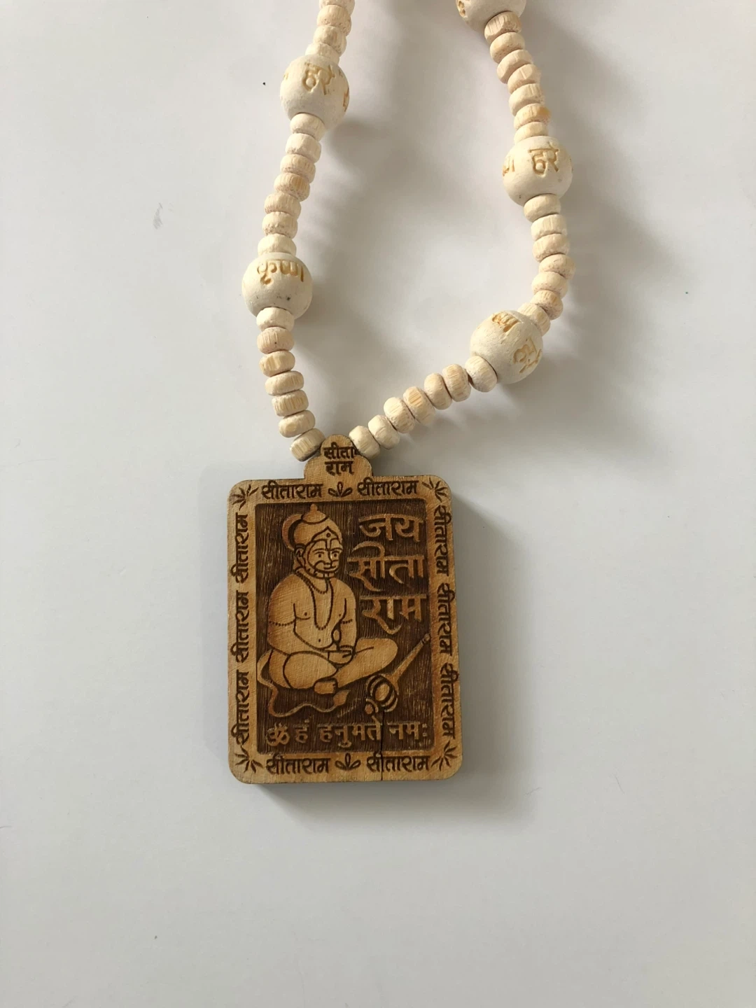 It is a mala with tulsi beads together with a pendant depicting Hanuman. The pendant is engraved with religious text and imagery. It's a spiritual accessory made of wood.