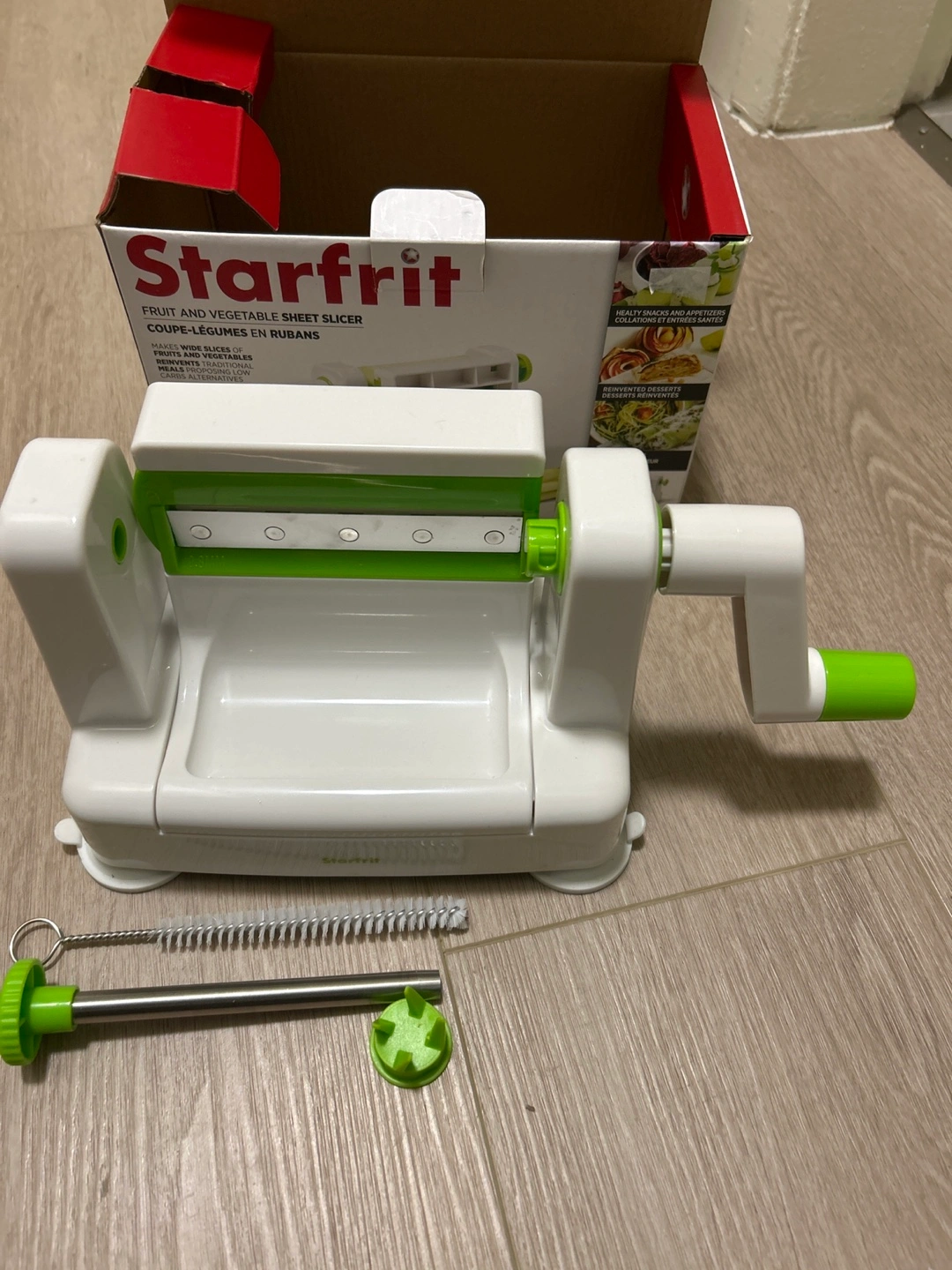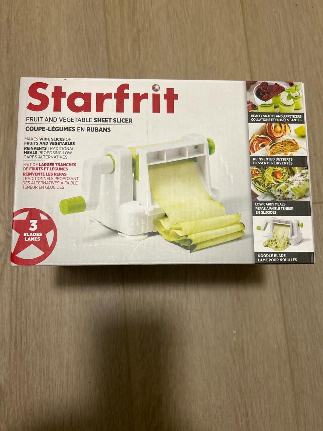 This Starfrit fruit and vegetable sheet slicer is great for making healthy snacks and low-carb meals. It comes with 3 blades for different cuts, including a noodle blade. The slicer is white and green.