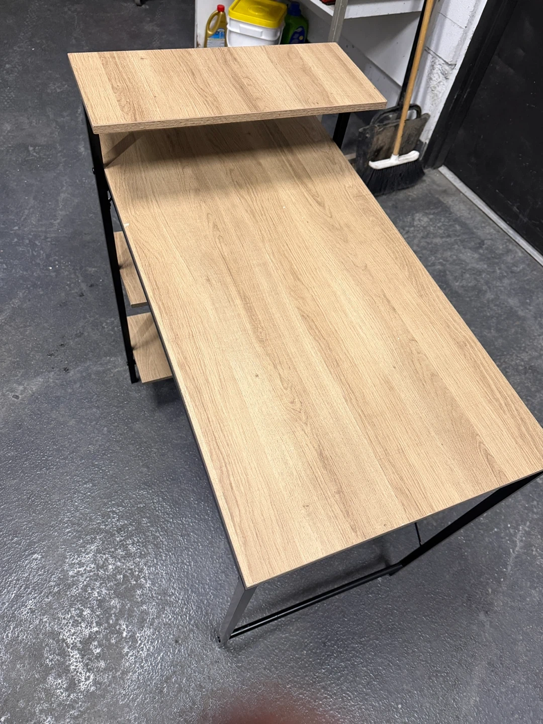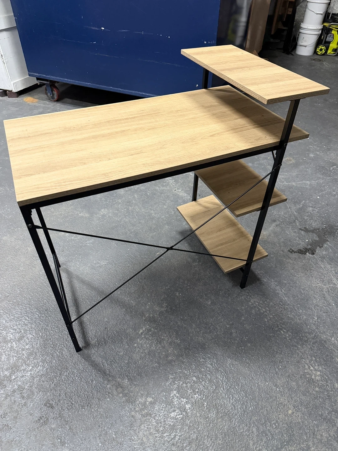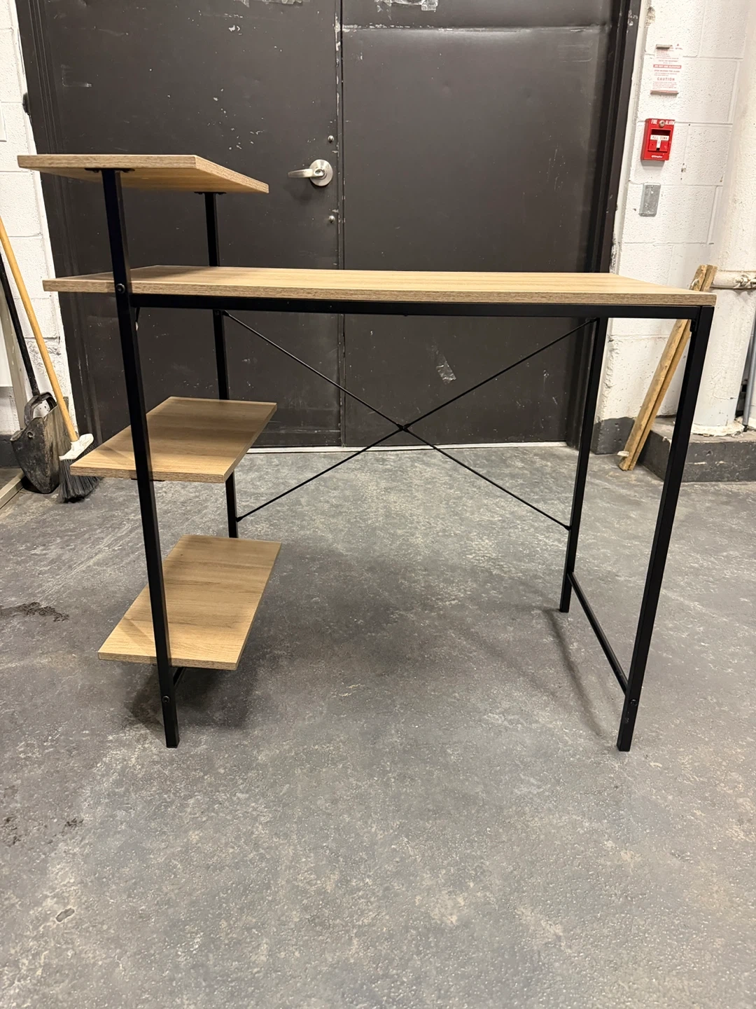This desk features a laminated surface with a natural oak wood grain and three shelves. Its sleek, modern design fits most spaces. The shelves offer convenient storage for books or office supplies.