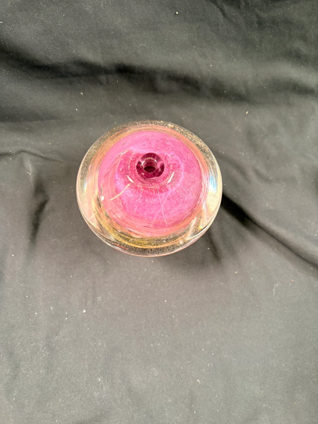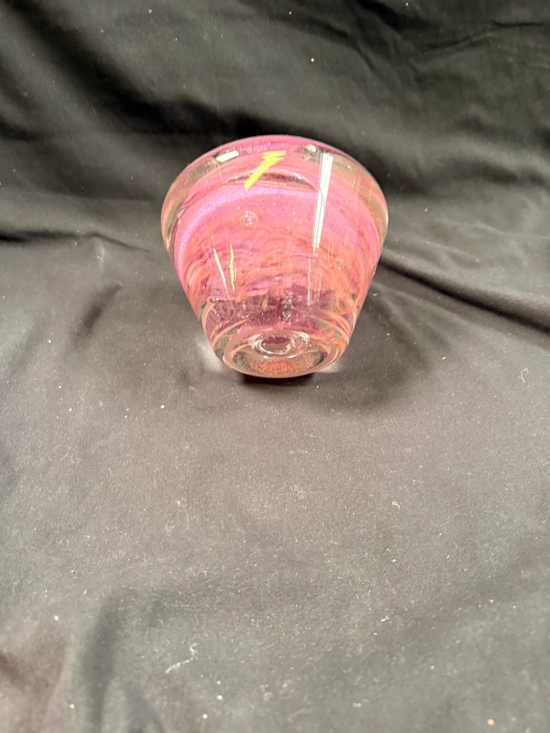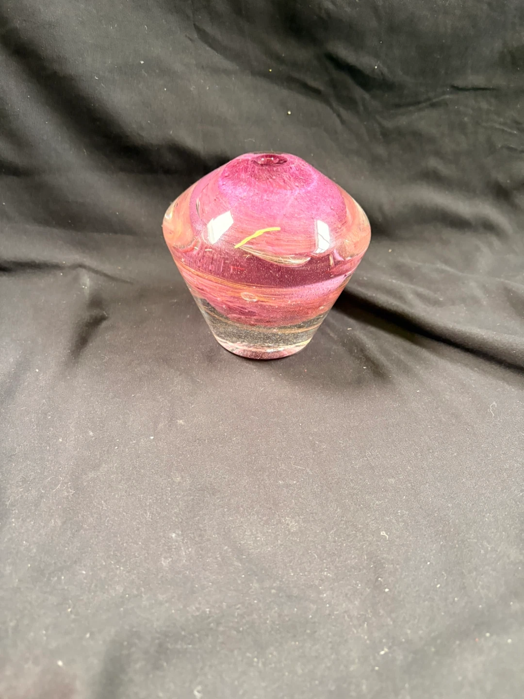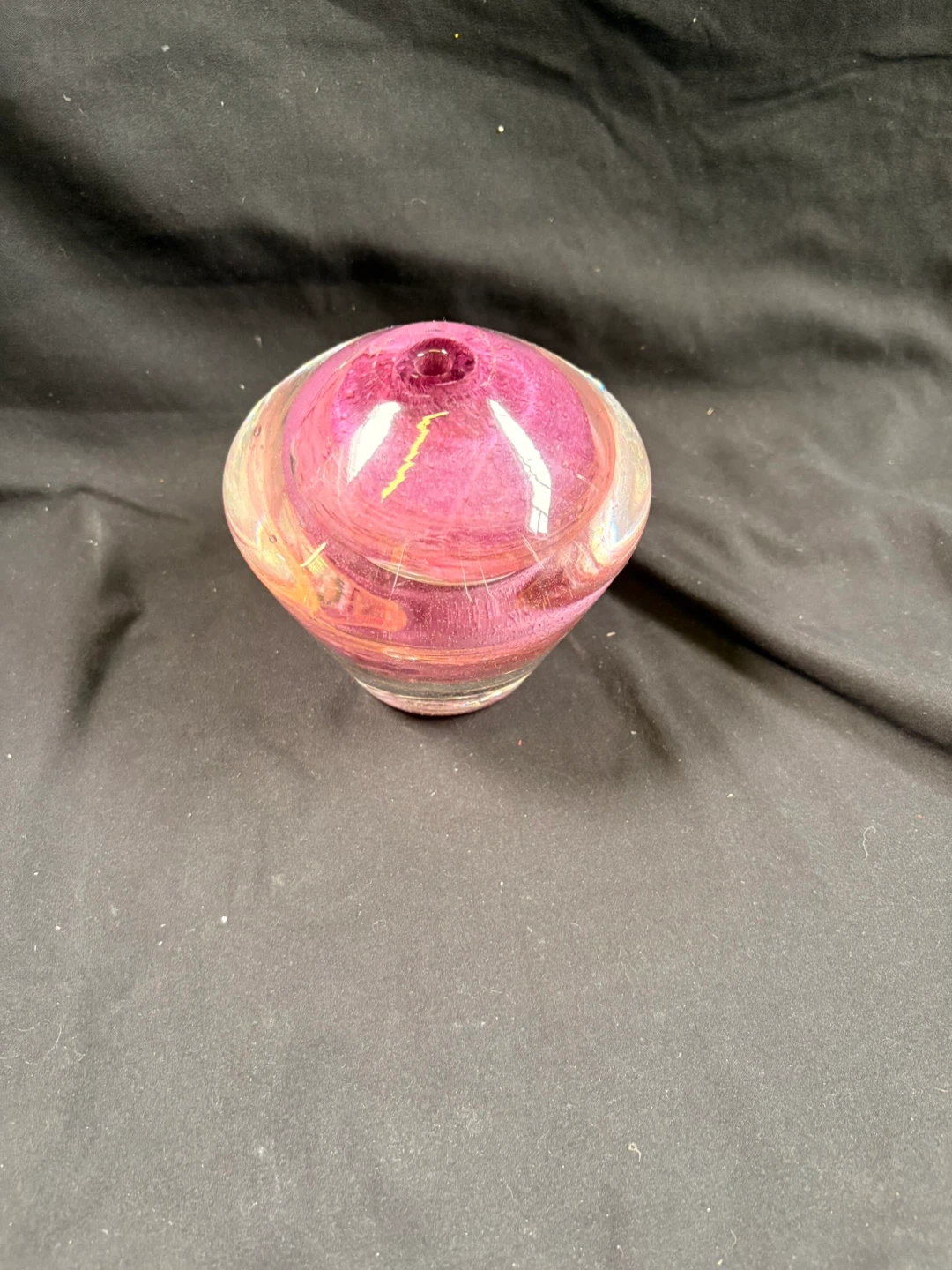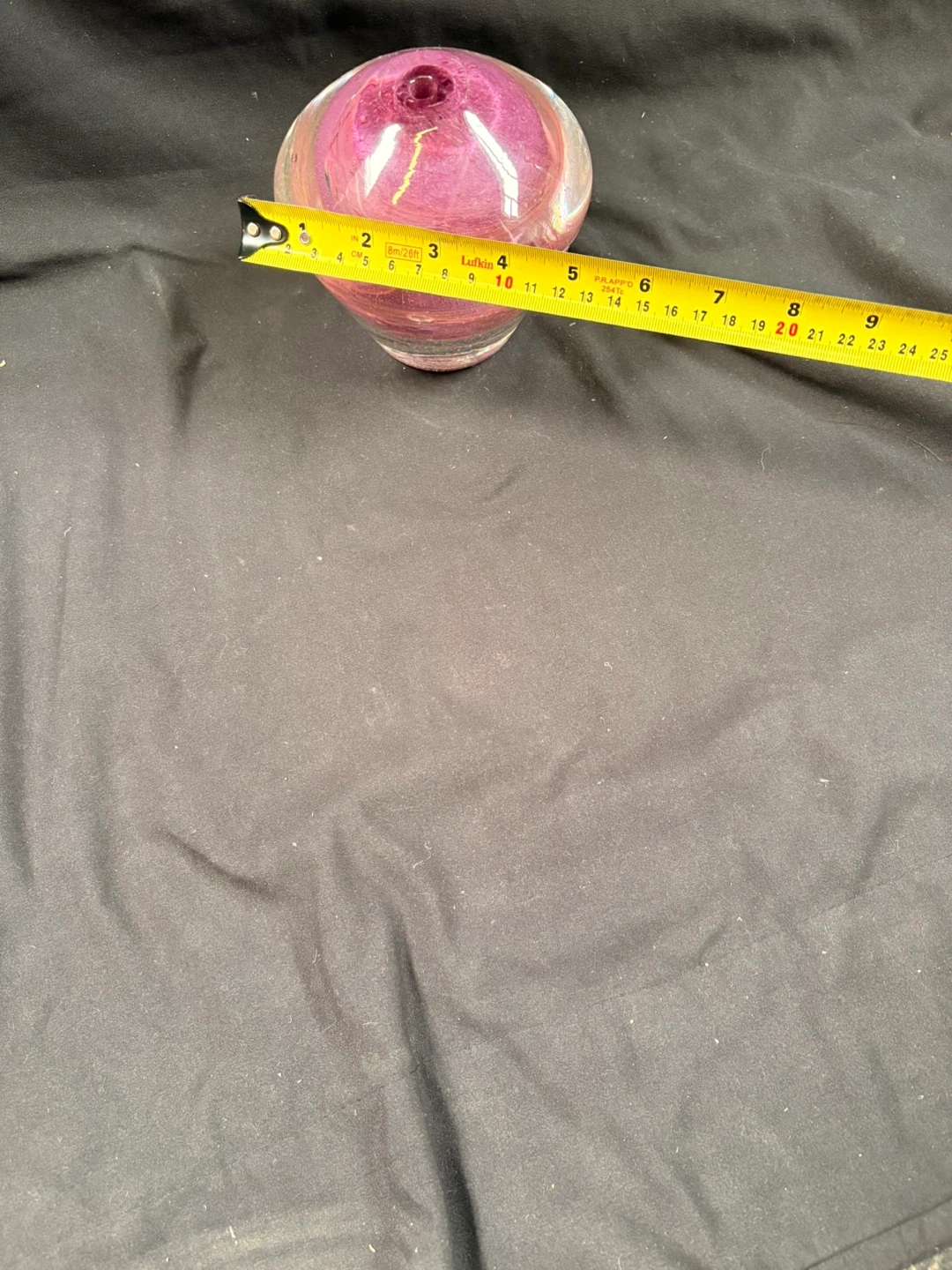 This is a beautiful hand-blown glass art vase with a vibrant pink and purple swirl design. It's approximately 5 inches tall and 4 inches wide at its widest point. Glass material.