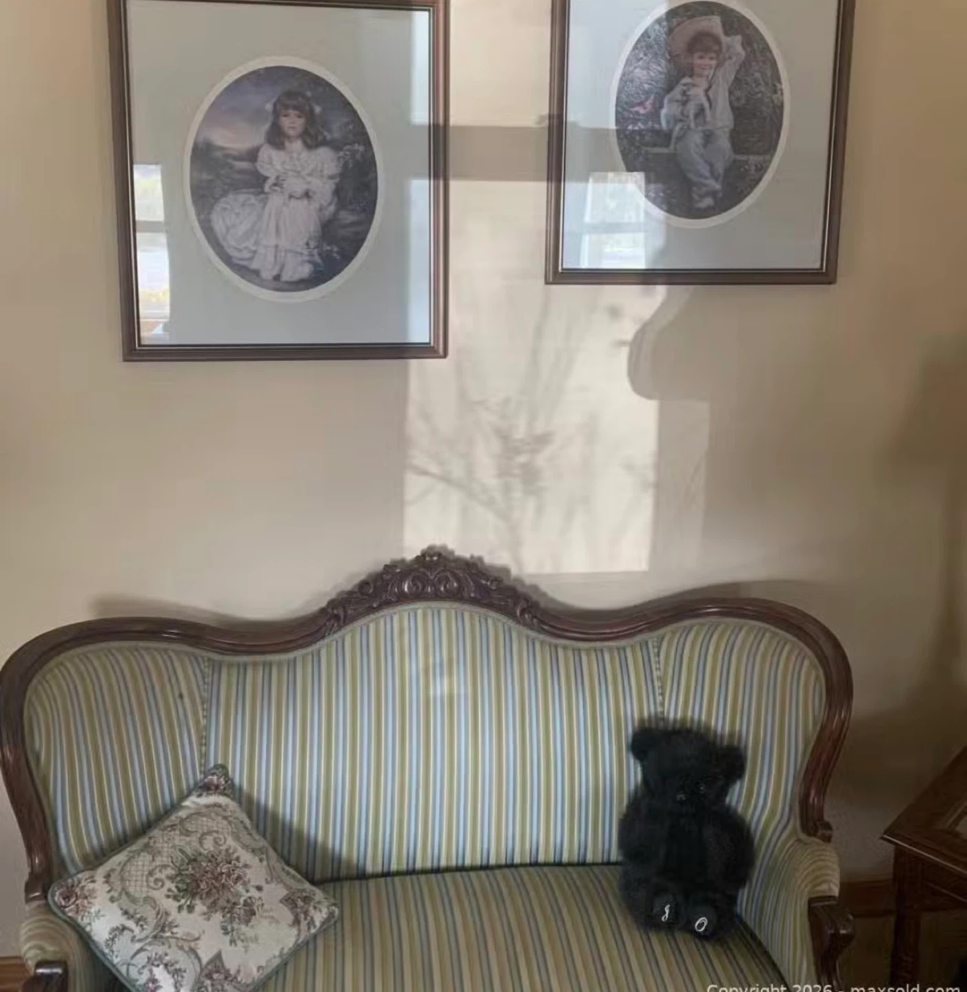 Selling a beautiful loveseat with an antique-inspired design. The upholstery features a striped pattern in soft, neutral tones. The frame is crafted with ornate detailing, adding to its vintage charm. It would be a great addition to any living room or sitting area!