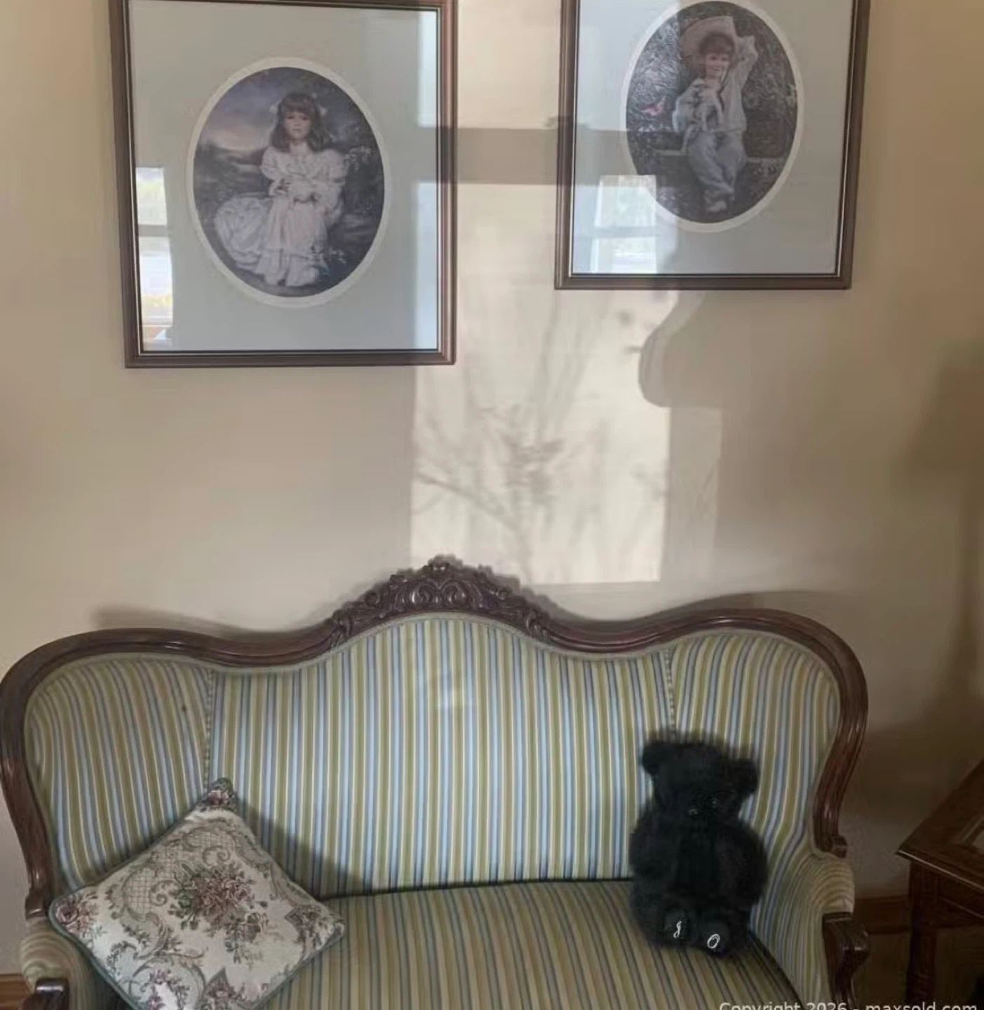 Selling a beautiful loveseat with an antique-inspired design. The upholstery features a striped pattern in soft, neutral tones. The frame is crafted with ornate detailing, adding to its vintage charm. It would be a great addition to any living room or sitting area!
