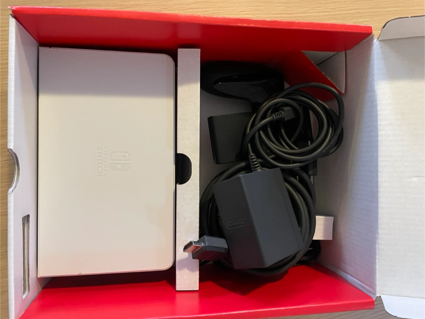 This is a Nintendo Switch OLED model in white. It's a fantastic console for gaming on the go or at home. Includes the console, Joy-Cons, and charging accessories.