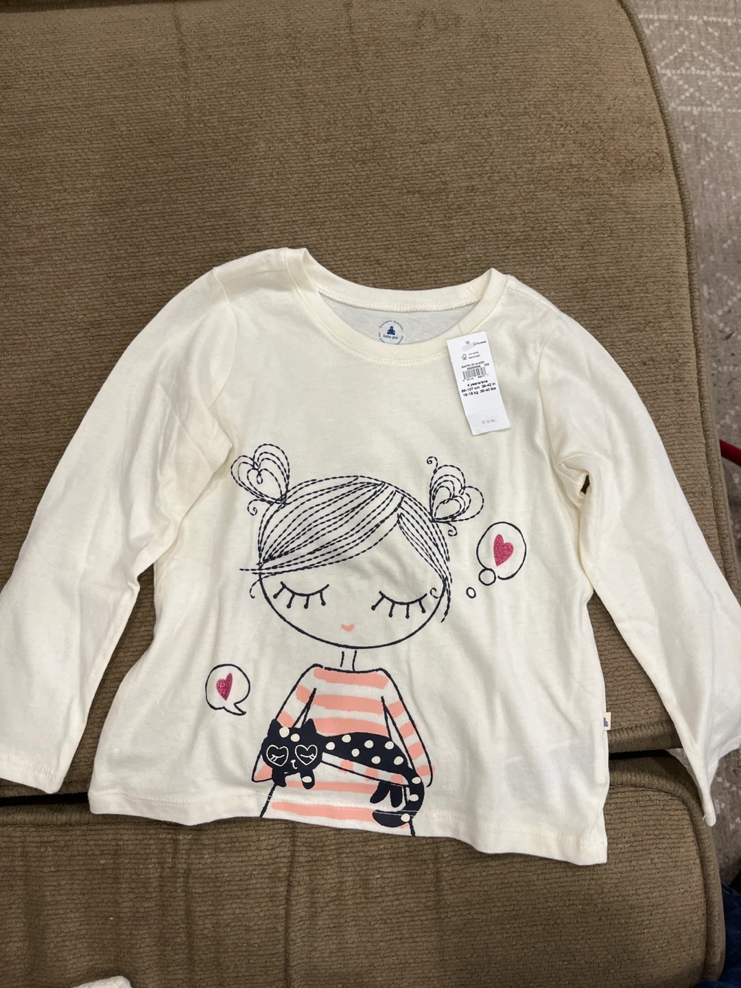 White long-sleeved t-shirt for girls. Features a graphic of a girl holding a cat. Made in Guatemala. Size 4 years, fits 99-107 cm or 39-42 inches, 16-18 kg or 36-40 lbs.