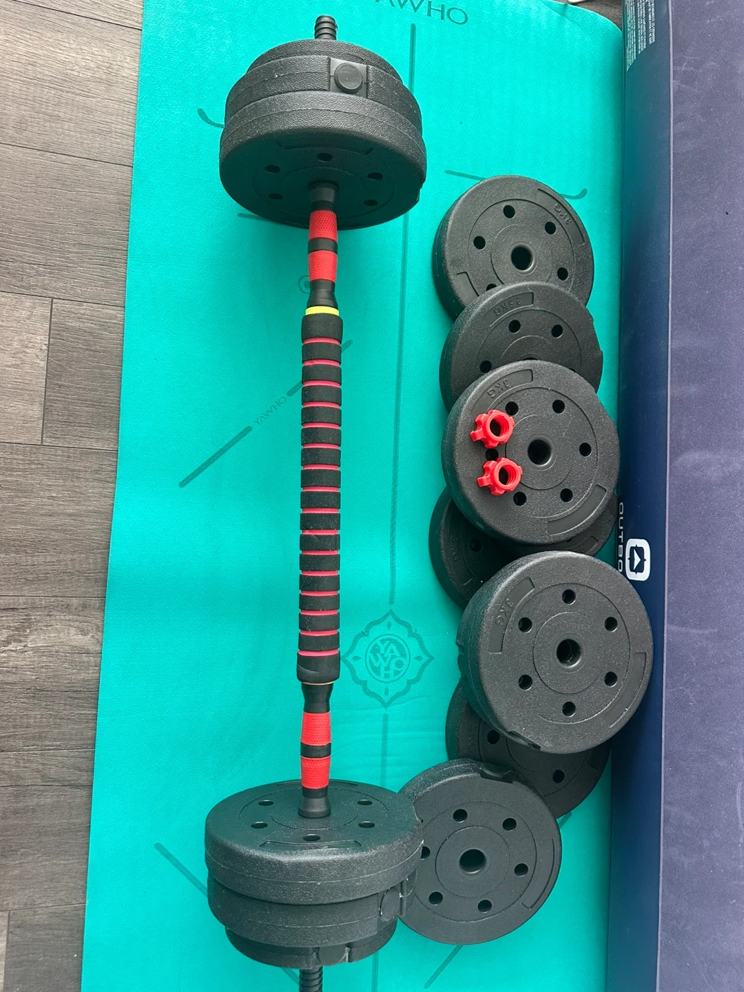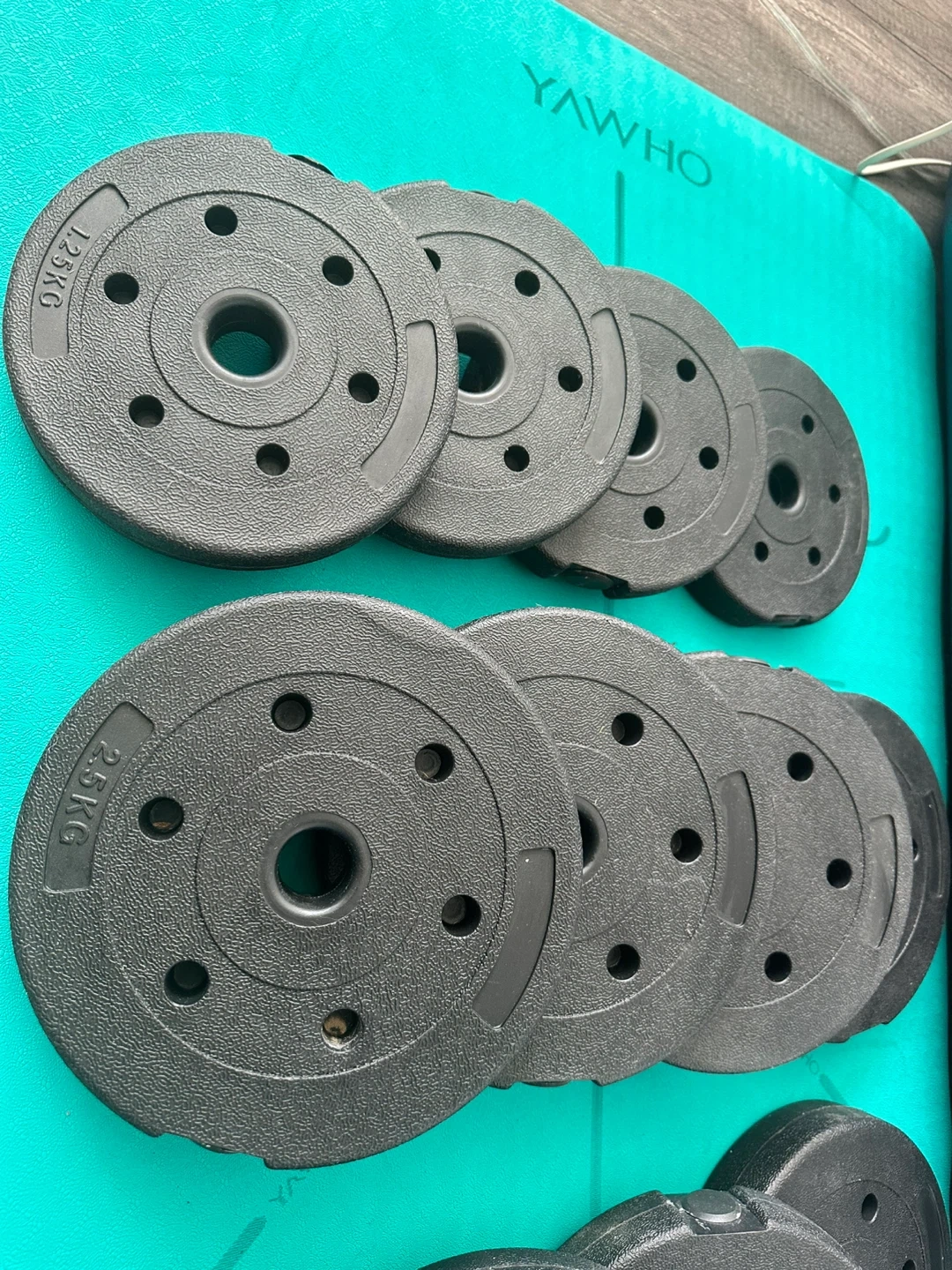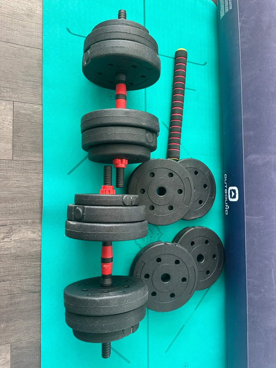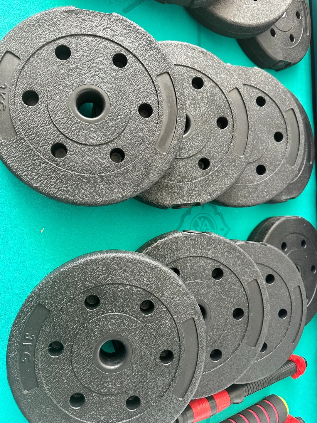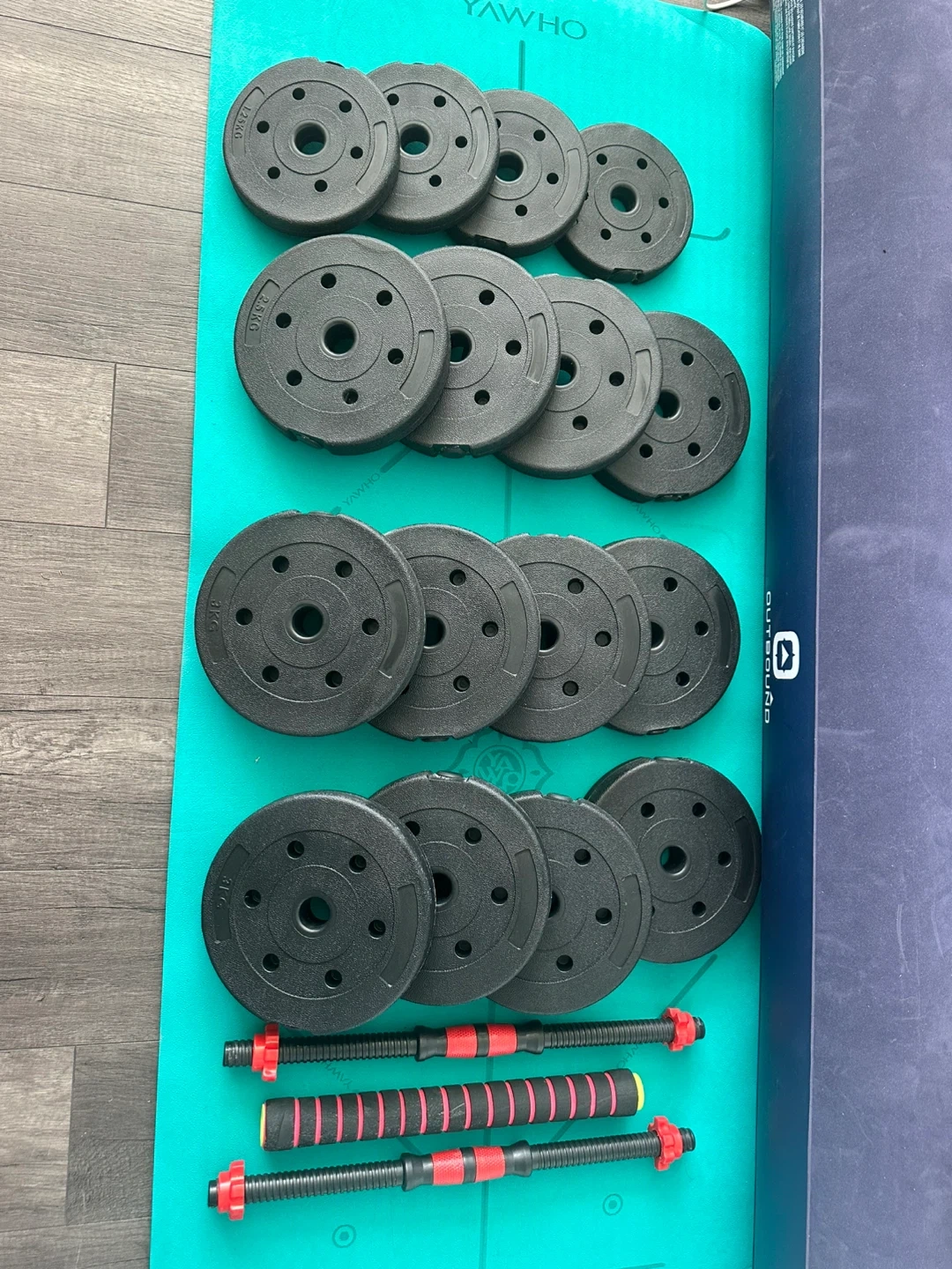 This adjustable dumbbell set includes 4x 3kg weights, 4x 2.5kg weights, and 4x 1.25kg weights. The adjustable handles have a non-slip grip. Perfect for home workouts!