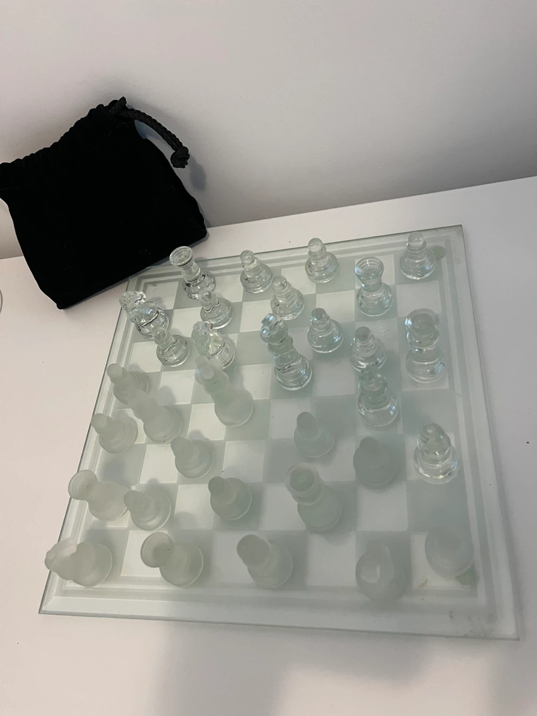 Beautiful clear and frosted glass chess set complete with all pieces and a black velvet storage pouch. It's a striking addition to any game night or decorative display. Perfect for anyone looking for an elegant way to play or display chess.