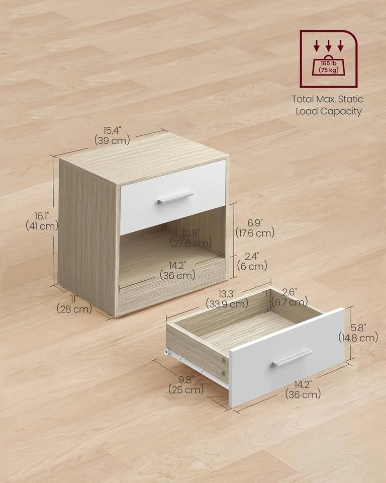 Set of 2 nightstands, fully assembled. Some minor damage on a small part of the front and back. These tables have a minimalist design and clean lines, offering a modern look. Made from sturdy particleboard with high-quality fittings, each table is stable and can hold up to 165 lb. The drawer holds up to 11 lb and glides smoothly and quietly. They work great as bedside tables, end tables, or small cabinets.