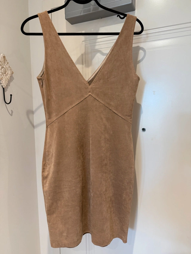 This is a Wilfred dress made of a soft, tan, suede-like material, perfect for a night out! It features a V-neckline , hugging your curves in all the right places. This dress has been worn but is still in great condition, ready for its next adventure. Additional details: * Brand: Wilfred * Colour: Tan * Style: curvy * Neckline: V-Neck Not lined, no tags. Fits US 4-6 Originally $168.