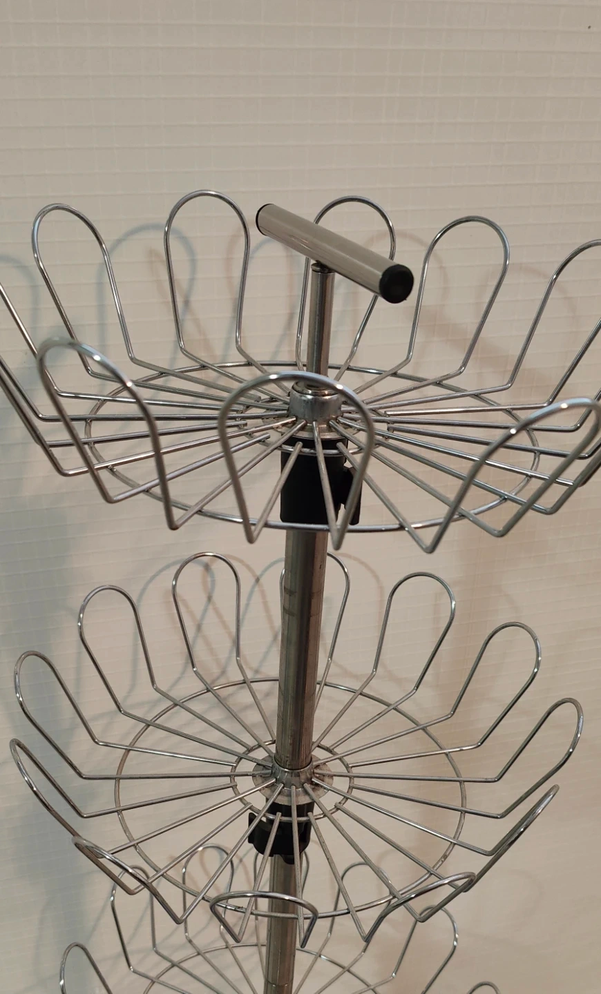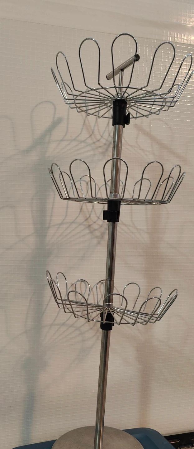 Chrome/silver-tone standing wire rack.
