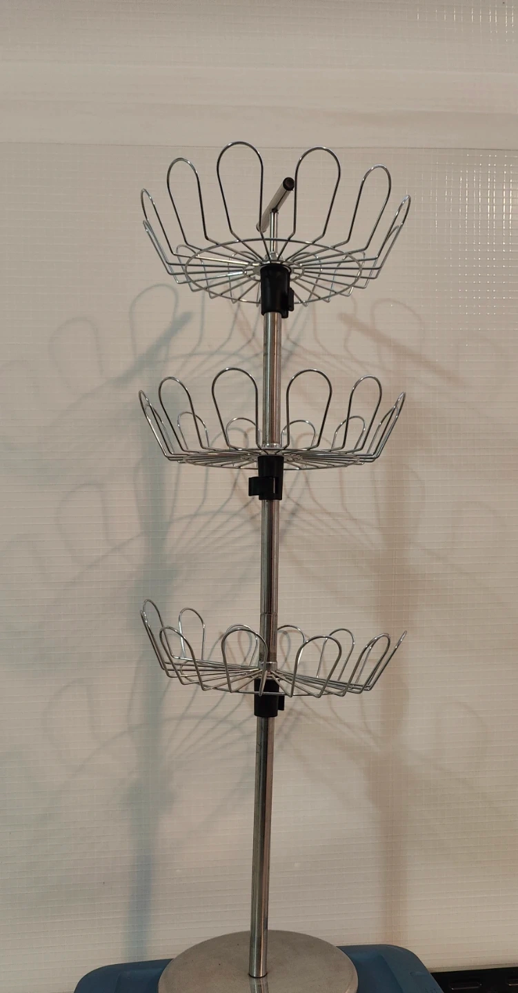 Chrome/silver-tone standing wire rack.