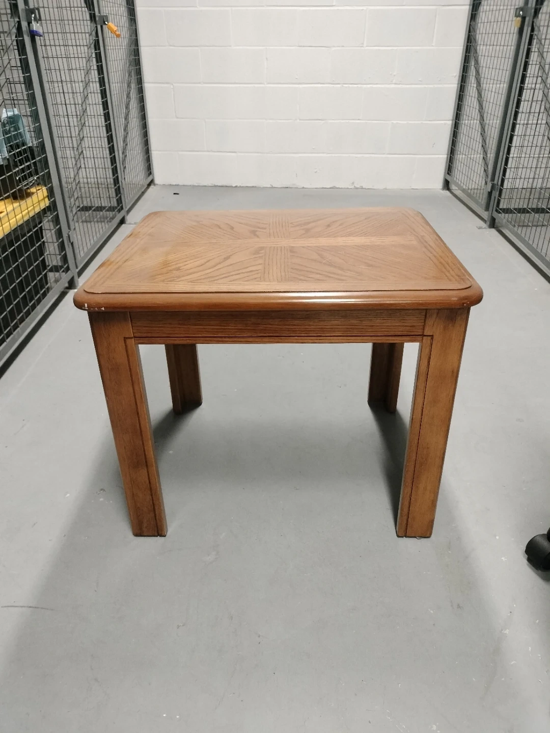 A sturdy wooden end table with a decorative parquet top. It's a nice brown wood colour. This table's compact size makes it suitable for placement beside a sofa or chair.