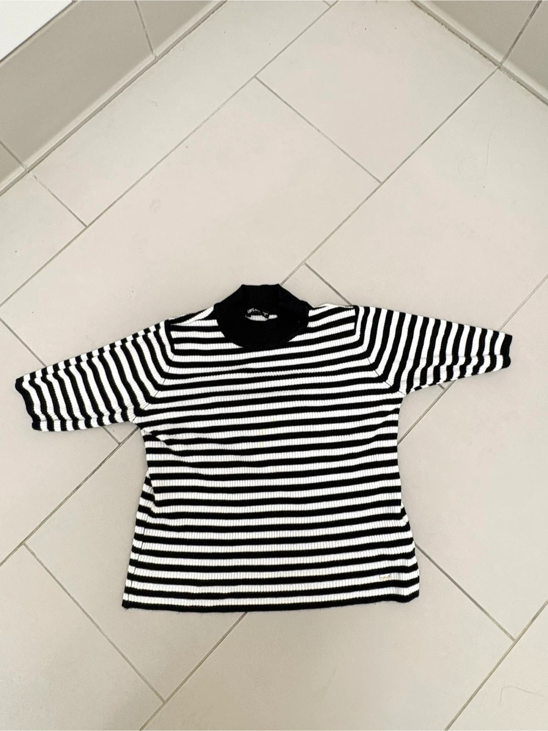 Black and white striped sweater from LOFT. It's a mock neck style with short sleeves. Made from a ribbed knit material.