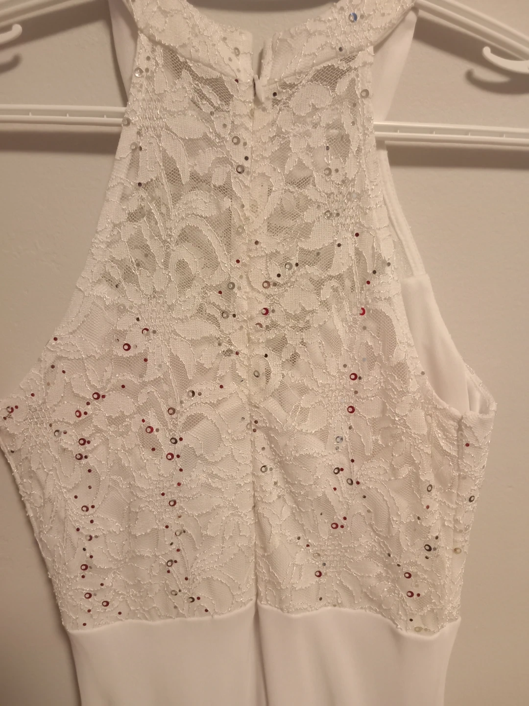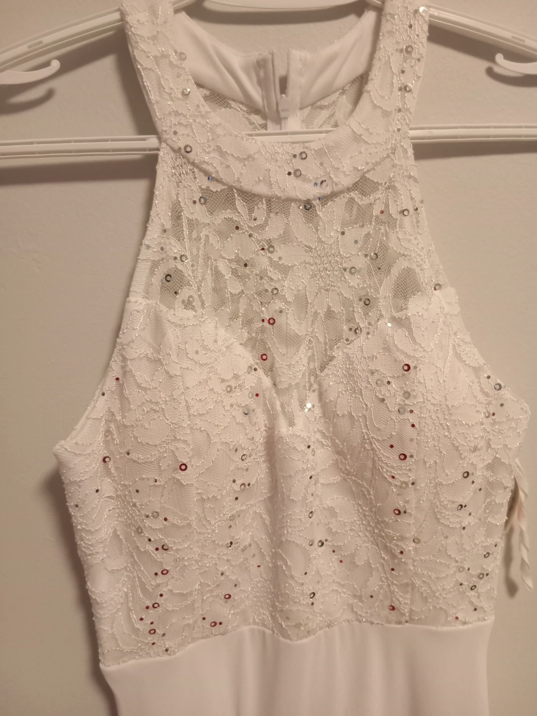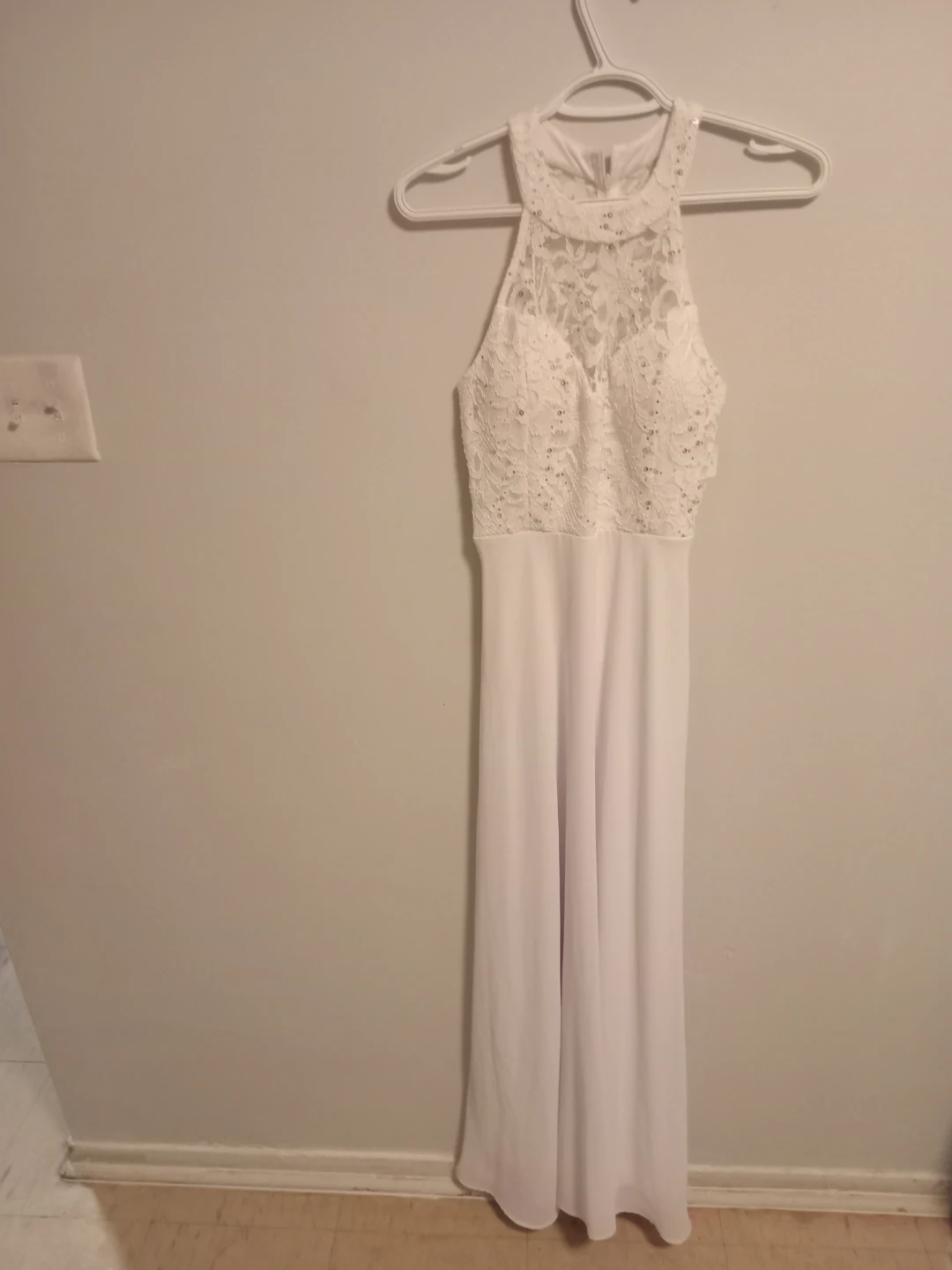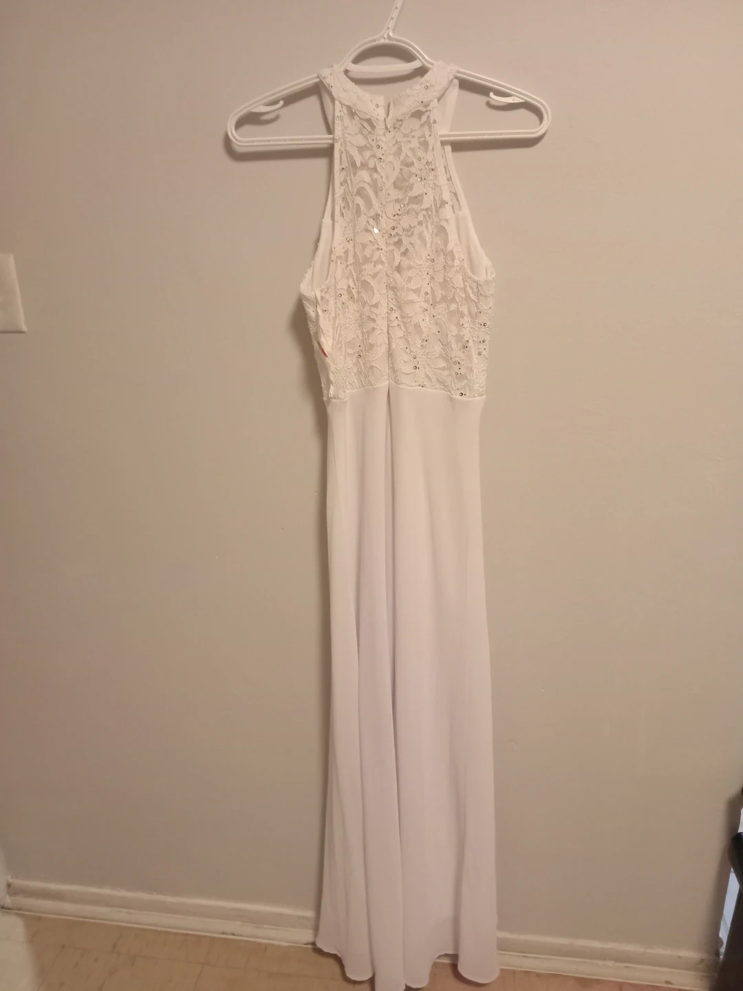 Selling a beautiful white maxi dress with a lace halter top. It features delicate detailing and a flowing skirt. Perfect for a special occasion or a summer event!