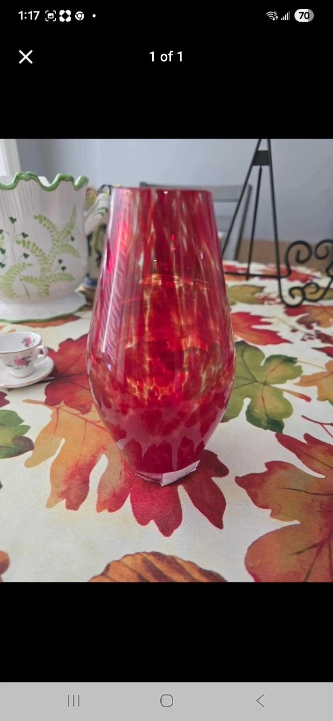 Buy & SellRed and Gold Swirl Glass VaseRed and Gold Swirl Glass Vase$12Vase with a red and gold swirled pattern. Made of glass. It's a lovely accent piece for any room!ConditionLike newWHERE TO MEETCheck LocationView MapSELLERLindyBeamsville150 reviews0 chats·0 favorites·5 viewsSEND CHAT TO SELLERHi Lindy! I’m interested in your listing.Hi Lindy! I’m interested in your listing.Get the Karrot app to chatSign In to chat
