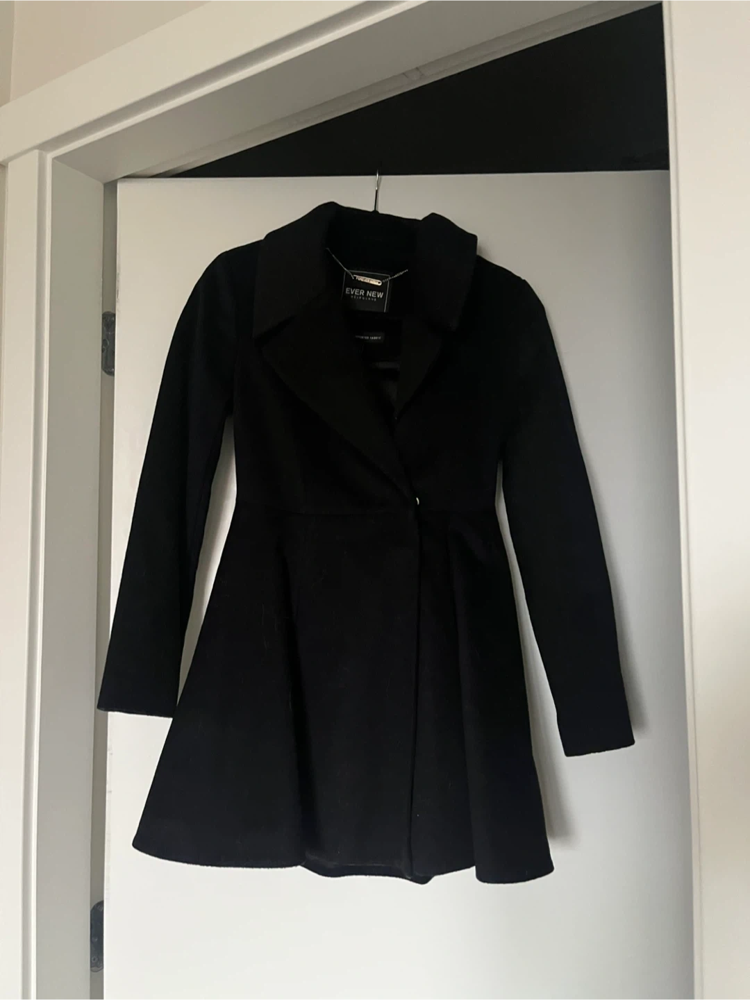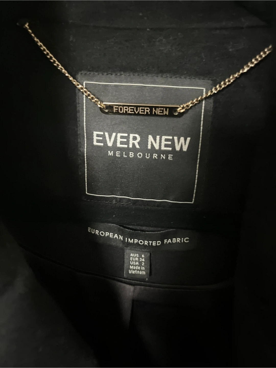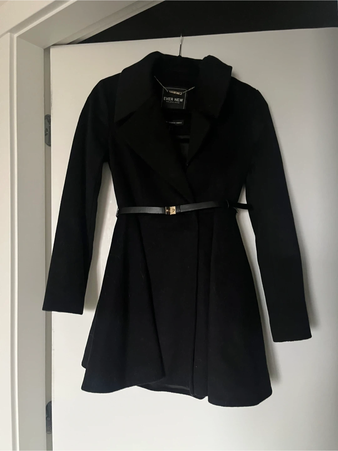 Worn a few times. This is an Ever New Melbourne black coat. It's made with imported fabric. The coat includes a matching belt.