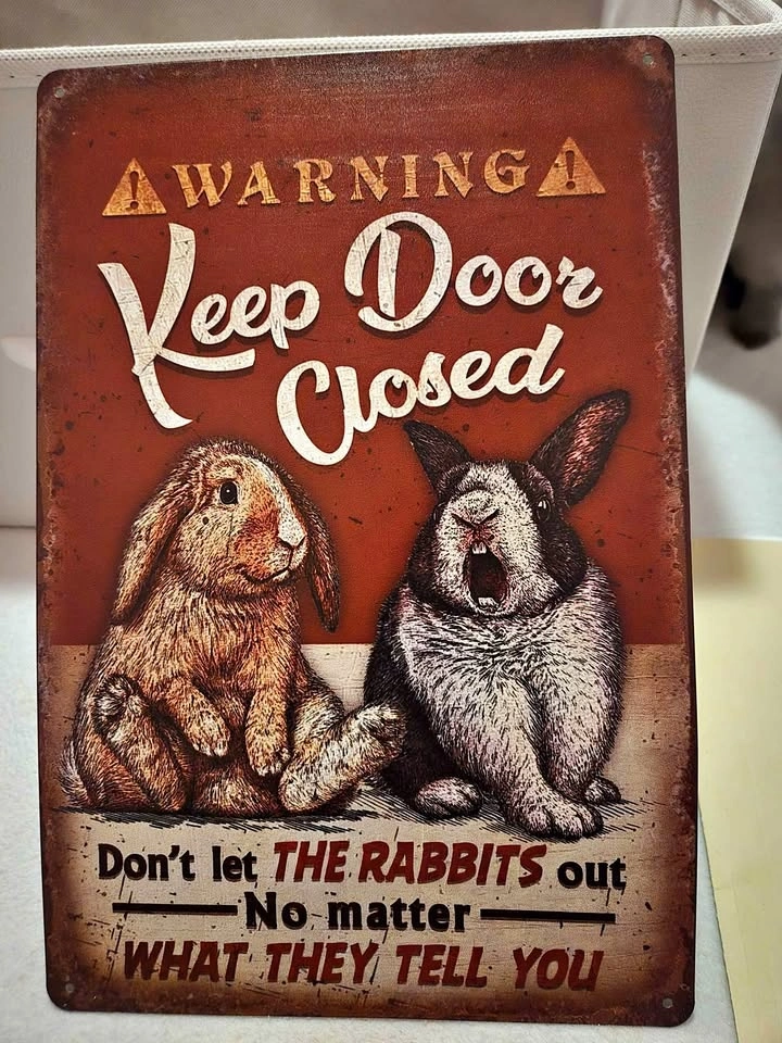 Selling a funny metal wall sign featuring two rabbits. Perfect for a bunny owner's room or near a playpen area. Message: "Warning: Keep Door Closed. Don't let the rabbits out no matter what they tell you." Material: Lightweight tin/metal with a vintage "rusty" look (printed design). Condition: Excellent condition. Never Used. Mounting: Has small pre-drilled holes in the corners for easy hanging. Price: $5.