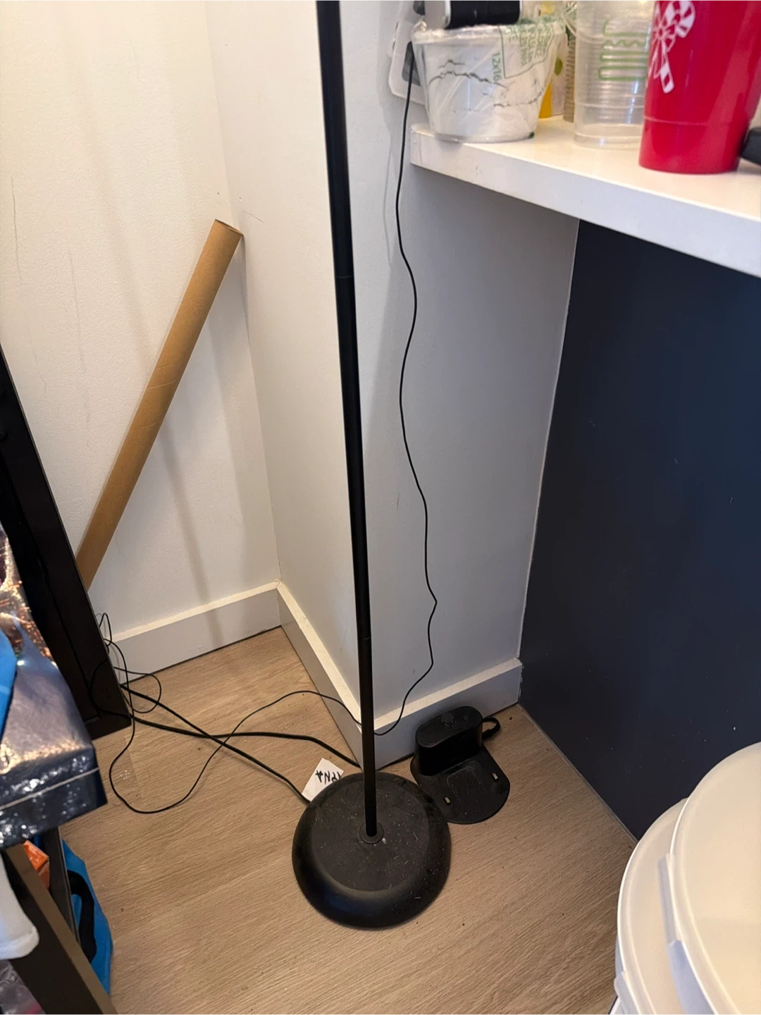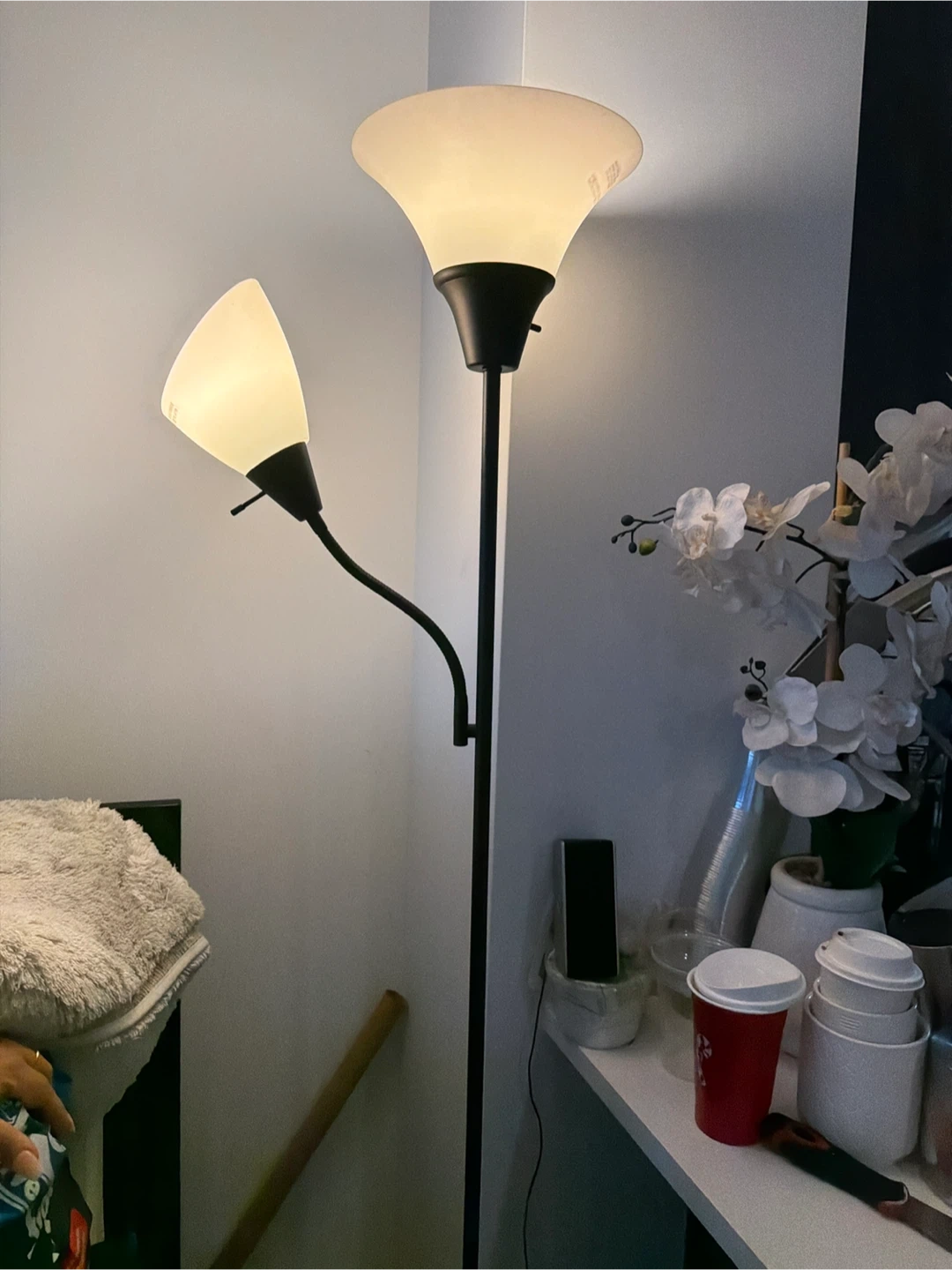 Black metal floor lamp with a main light and an adjustable reading light. The lampshades are frosted glass. It stands tall and provides ambient and task lighting.