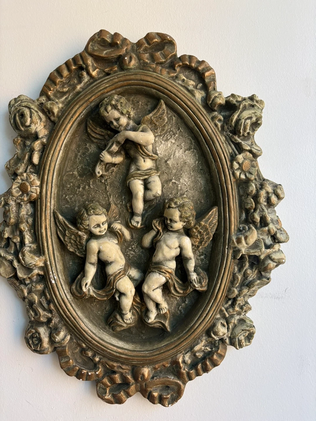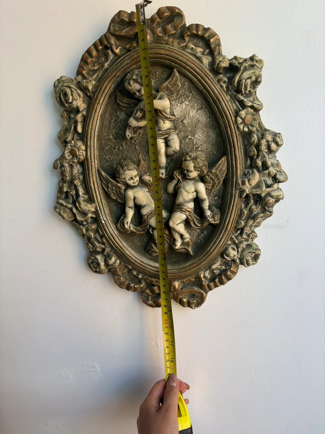 Selling a vintage cherub wall art piece! It features three cherubs in an oval frame with a floral design. The frame measures approximately 16 inches in height and 12 inches in width. It's a unique and charming piece to add to your home decor