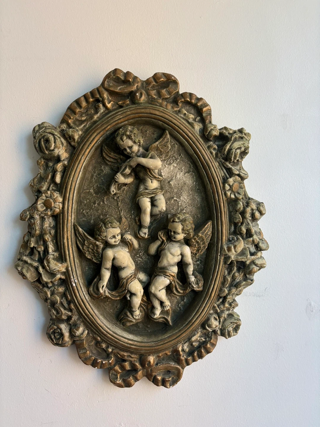 Selling a vintage cherub wall art piece! It features three cherubs in an oval frame with a floral design. The frame measures approximately 16 inches in height and 12 inches in width. It's a unique and charming piece to add to your home decor