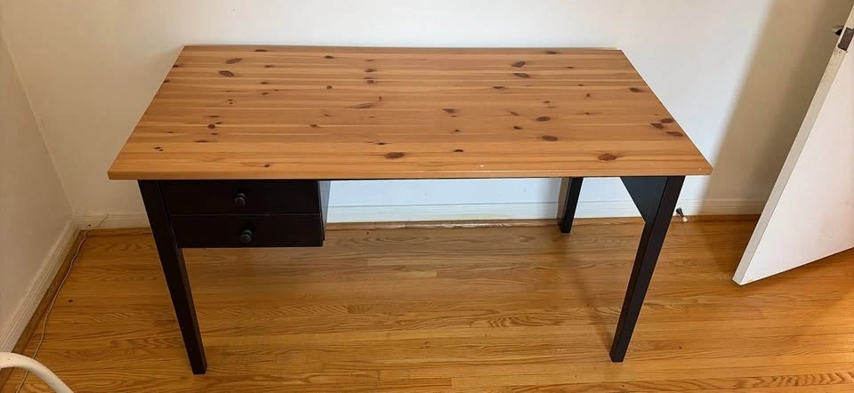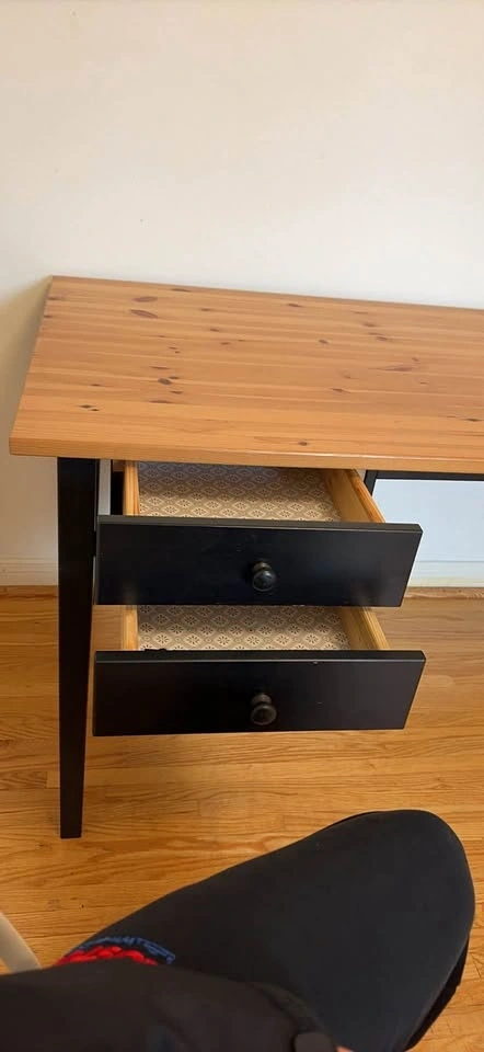 Solid pine desk with a natural wood top and black legs. Features two side drawers with decorative patterned liners and black knobs. Sturdy construction with clean lines. Dimensions: 54" W x 28" D x 29" H.
