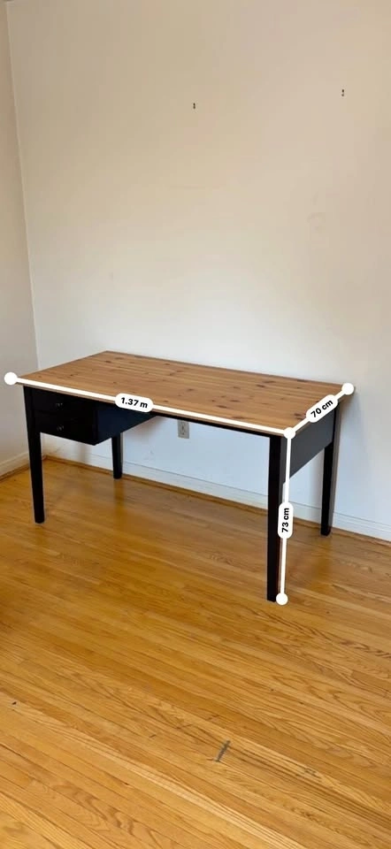 Solid pine desk with a natural wood top and black legs. Features two side drawers with decorative patterned liners and black knobs. Sturdy construction with clean lines. Dimensions: 54" W x 28" D x 29" H.