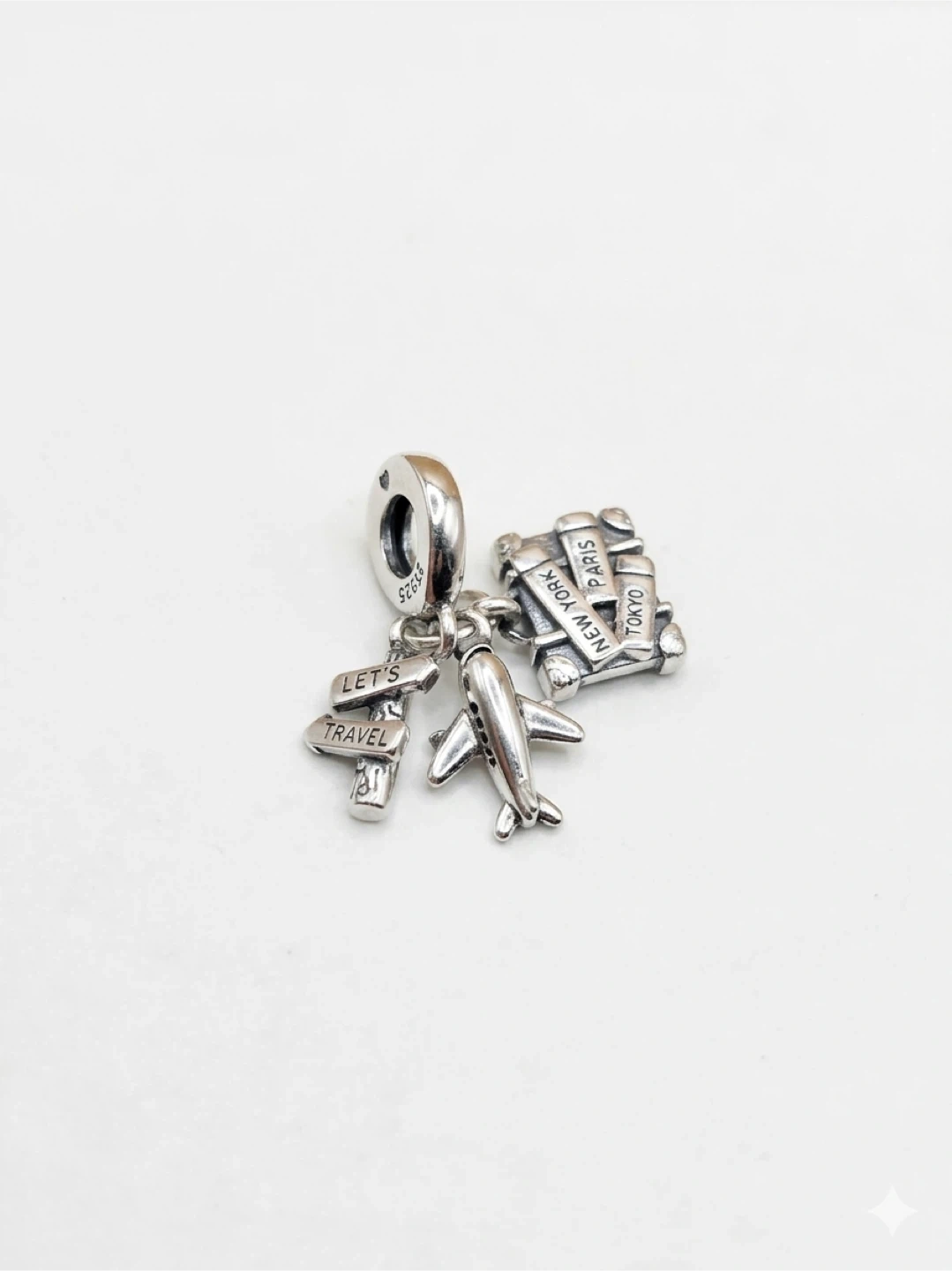 ✈️This sterling silver 925 charm features an airplane, a 'Let's Travel' signpost, and a suitcase. The suitcase is adorned with the names 'New York', 'Paris', and 'Tokyo'. It's made of sterling silver and is perfect for adding to a bracelet.