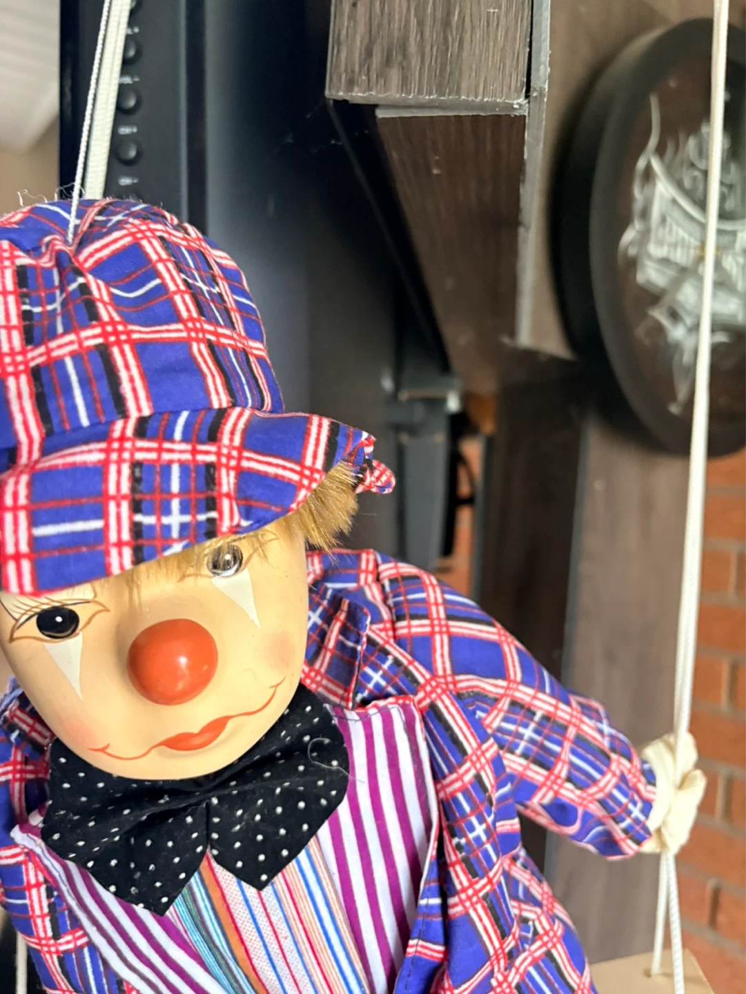 A decorative clown marionette, dressed in a colourful plaid outfit and hat, swings from a rope. It's designed with a painted face, red nose, and a polka dot bow tie. This playful piece adds a whimsical touch to any space.