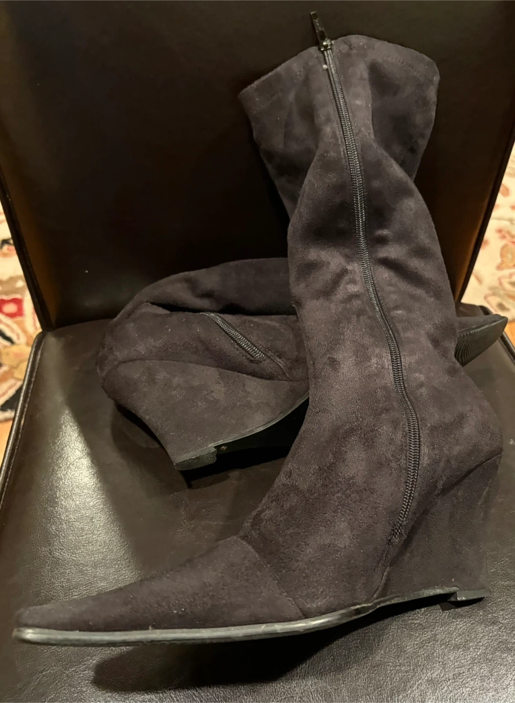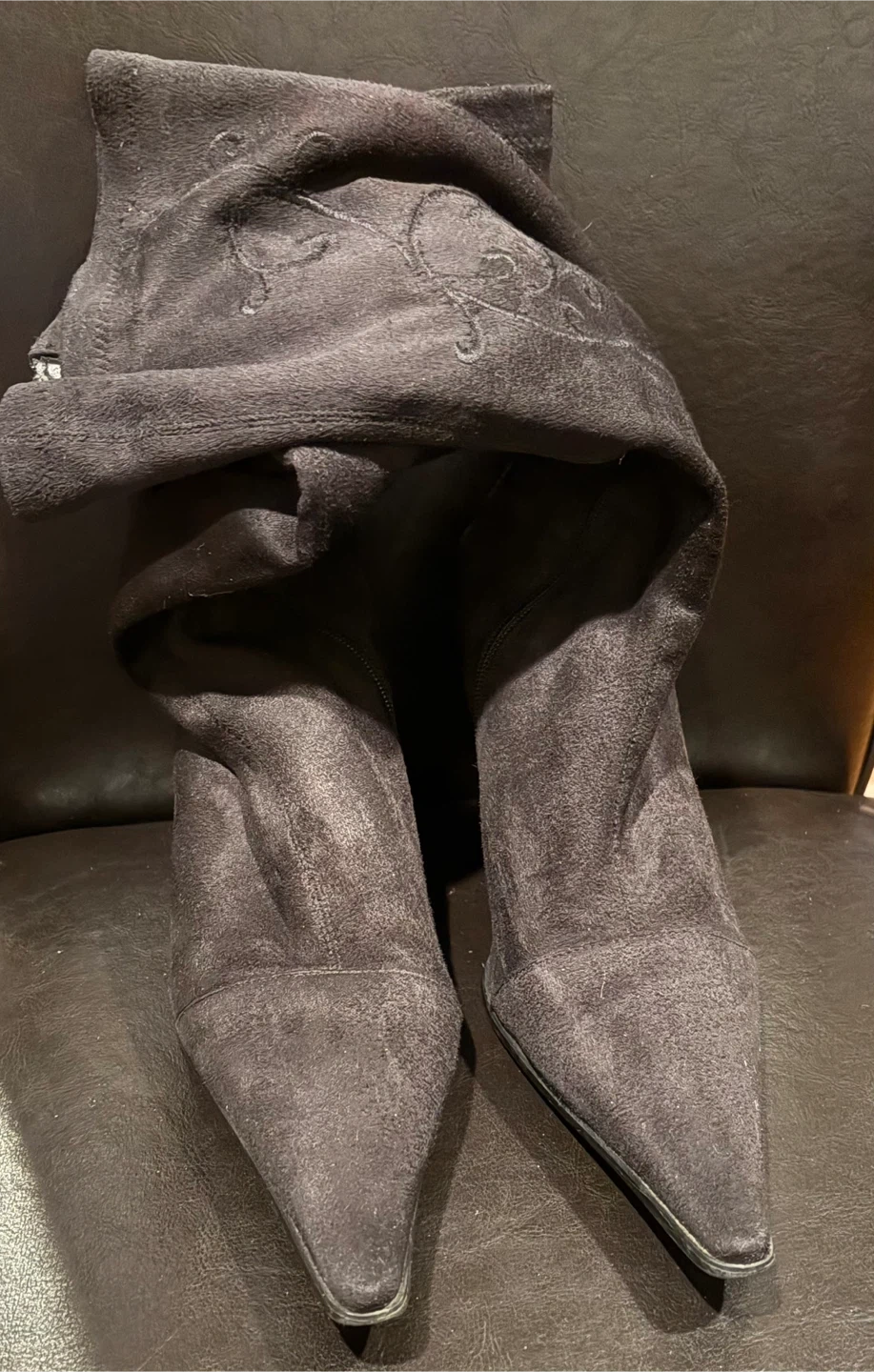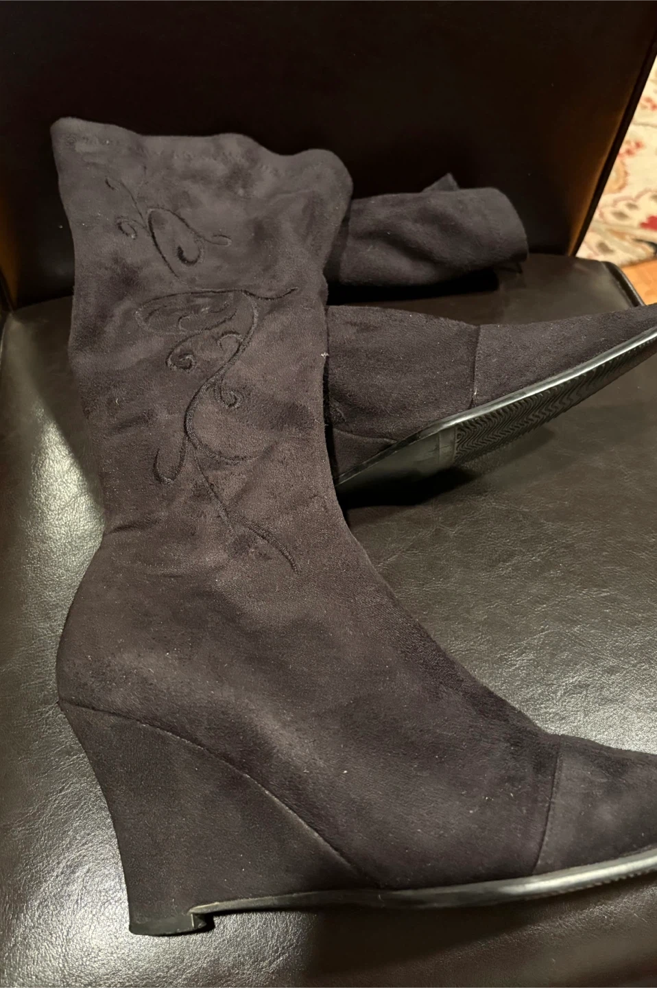 These D'AngelO boots are a chic black suede with elegant embroidery. They feature a pointed toe and a wedge heel for added height. Zipper closure for easy on and off. Size 41. Cash only, no e-transfers. Pick up only.