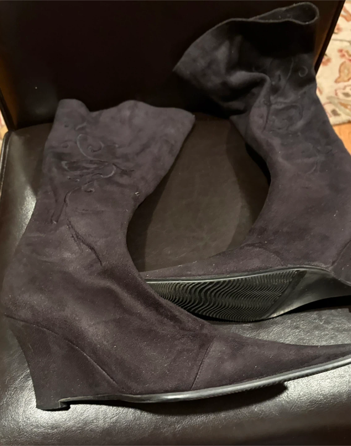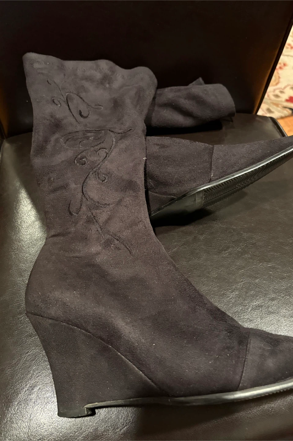 These D'AngelO boots are a chic black suede with elegant embroidery. They feature a pointed toe and a wedge heel for added height. Zipper closure for easy on and off. Size 41. Cash only, no e-transfers. Pick up only.