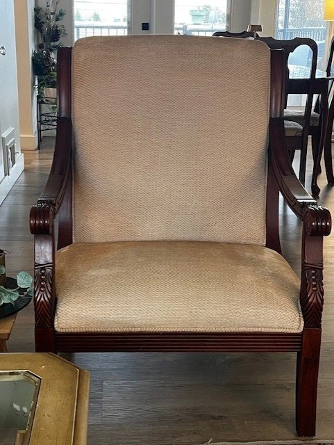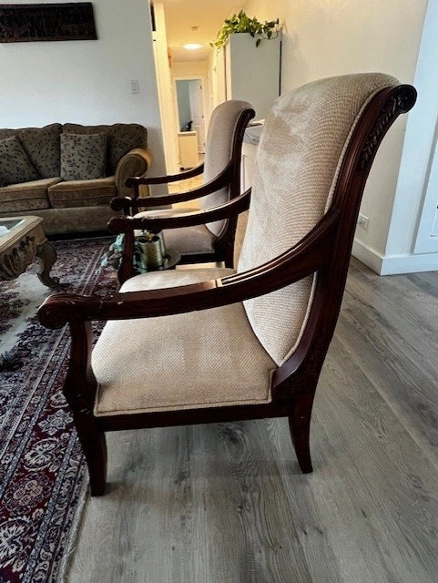 Two large accent armchairs available. Each chair is approximately 26” wide seating with a solid wooden frame and comfortable upholstered seats. Ideal for a living room or reading corner. Pickup from New Westminster.