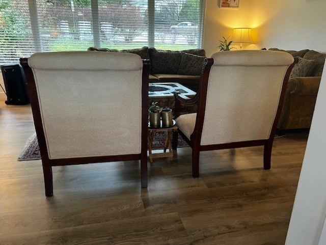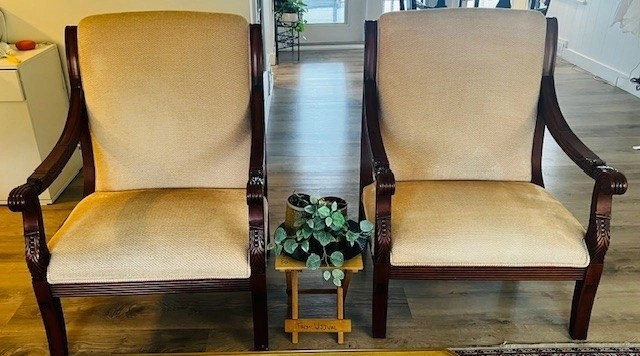 Two large accent armchairs available. Each chair is approximately 26” wide seating with a solid wooden frame and comfortable upholstered seats. Ideal for a living room or reading corner. Pickup from New Westminster.