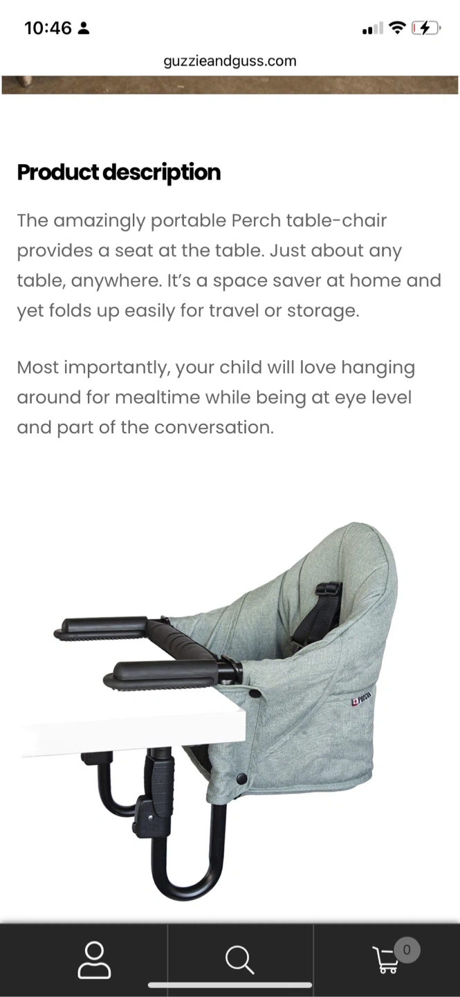Selling a Guzzie+Guss Perch clip-on table chair! It's in great condition and perfect for travel, restaurants, picnics, or even at home. Easy to set up and provides secure and portable seating. The fabric is machine washable, so it's easy to keep clean. Also includes a grey Guzzie+Guss placemat!