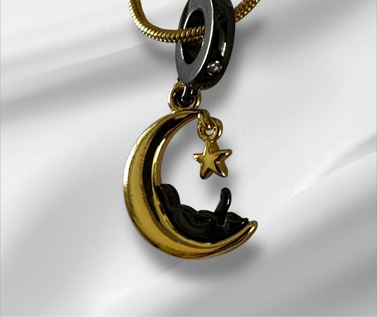 Cute stainless steel chain featuring a gold crescent moon with a black cat inside, plus a dangling gold star. The chain is also gold tone and comes with a box.