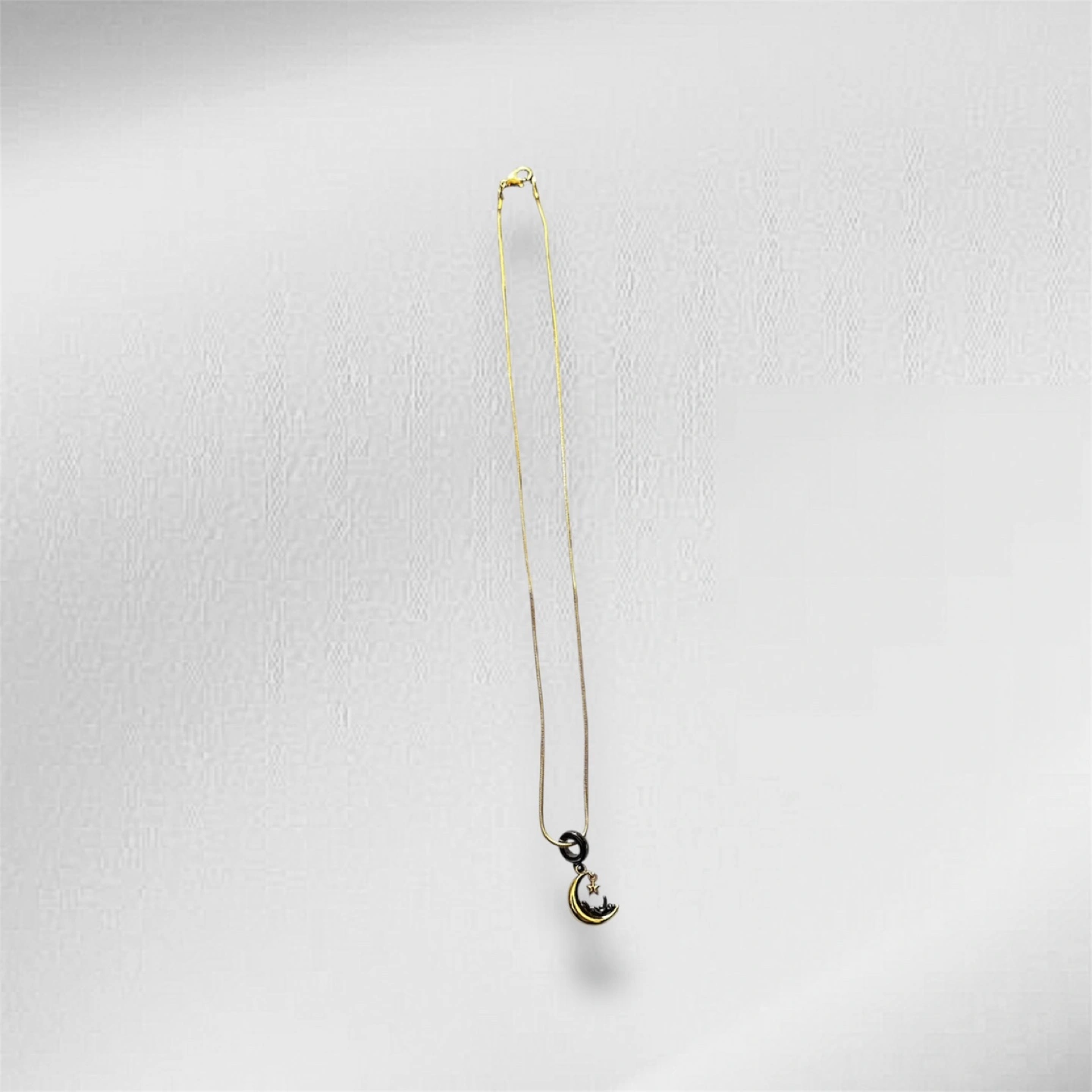Cute stainless steel chain featuring a gold crescent moon with a black cat inside, plus a dangling gold star. The chain is also gold tone and comes with a box.