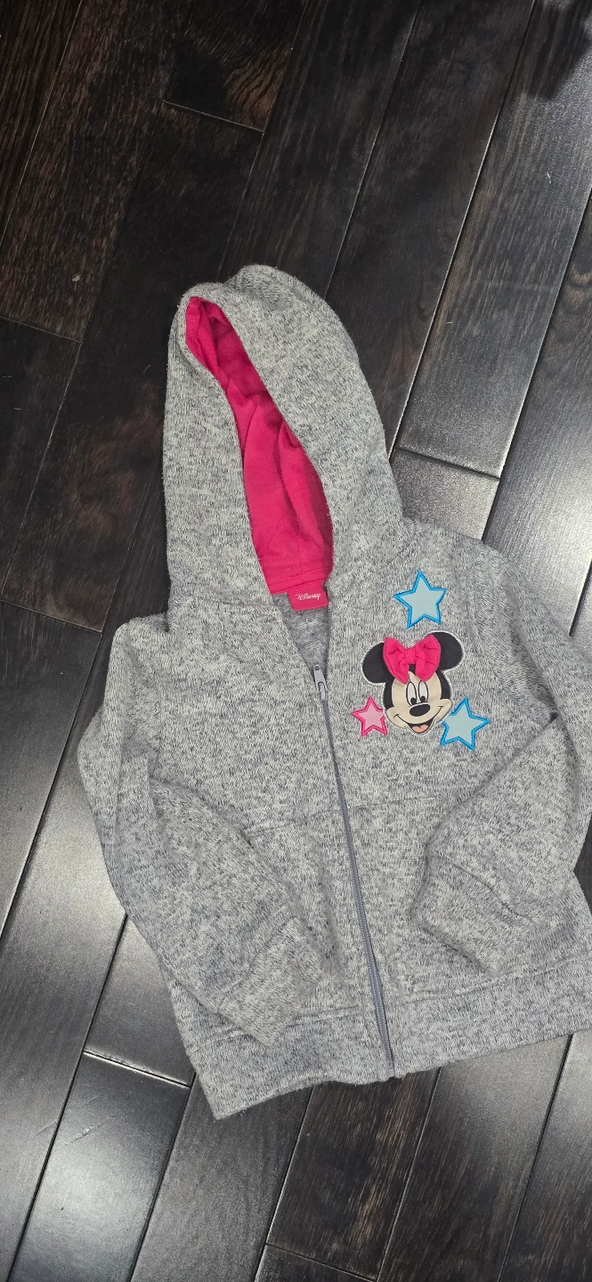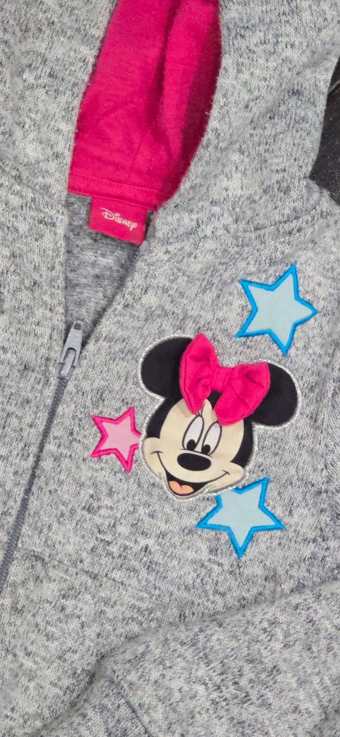 Grey hoodie. Featuring Minnie Mouse patch and star accents. Zips up the front and has a hoodie.