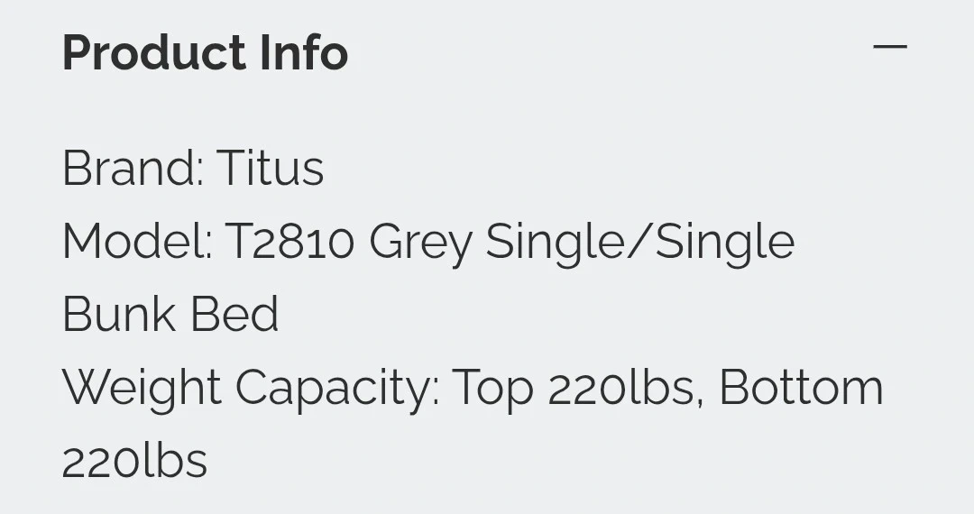 This is a Titus T2810 Grey Single/Single bunk bed frame. It features a modern metal design and includes slats and a built-in ladder. No box spring is required for this sturdy bed. Dimensions: 42"W 77"D 60"H. Top and bottom weight capacity is 220lbs each.