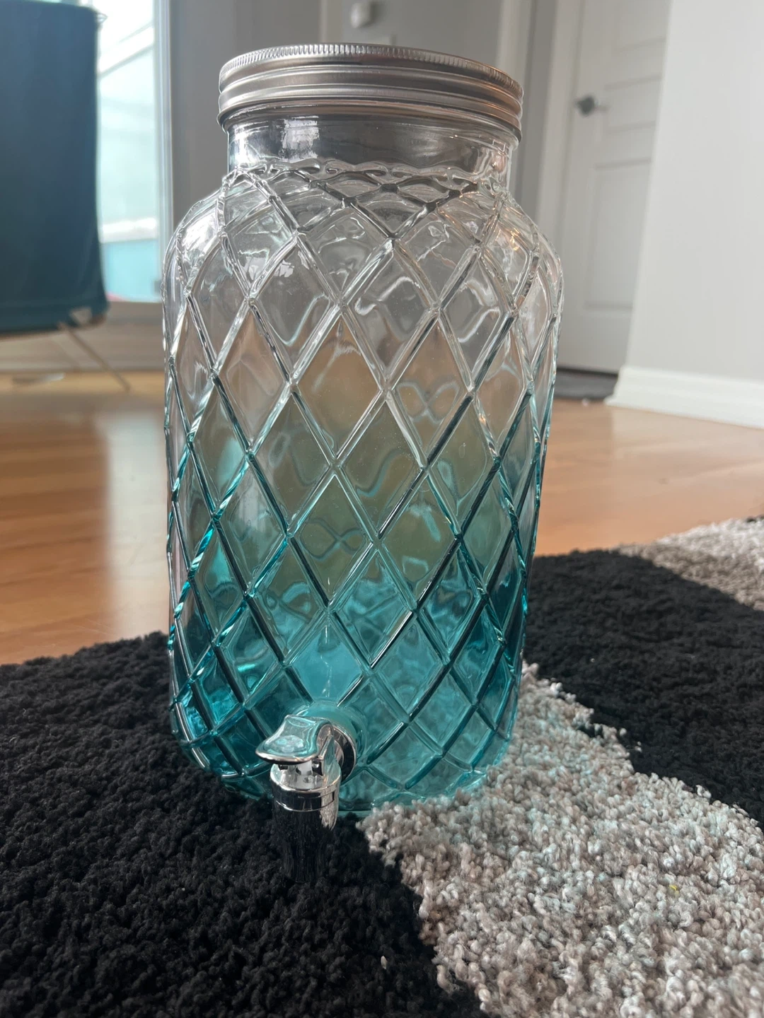 Almost new ( used only once for water )This glass beverage dispenser has a diamond pattern and a blue gradient. It comes with a metal spigot for easy serving. Great for parties or gatherings!