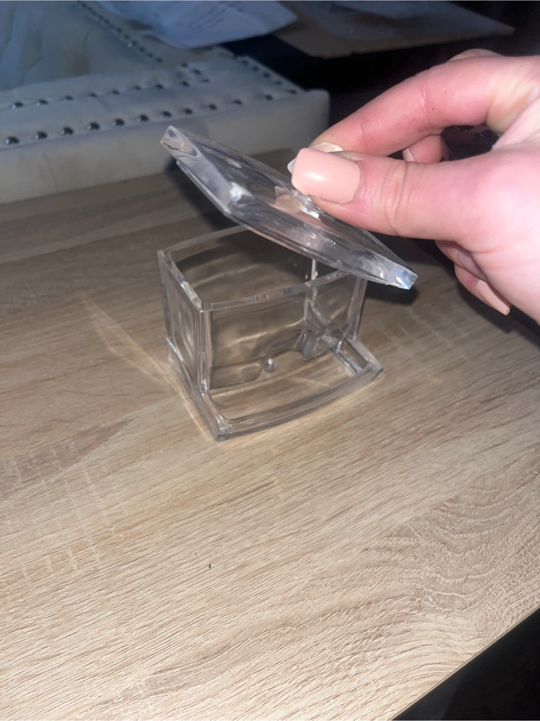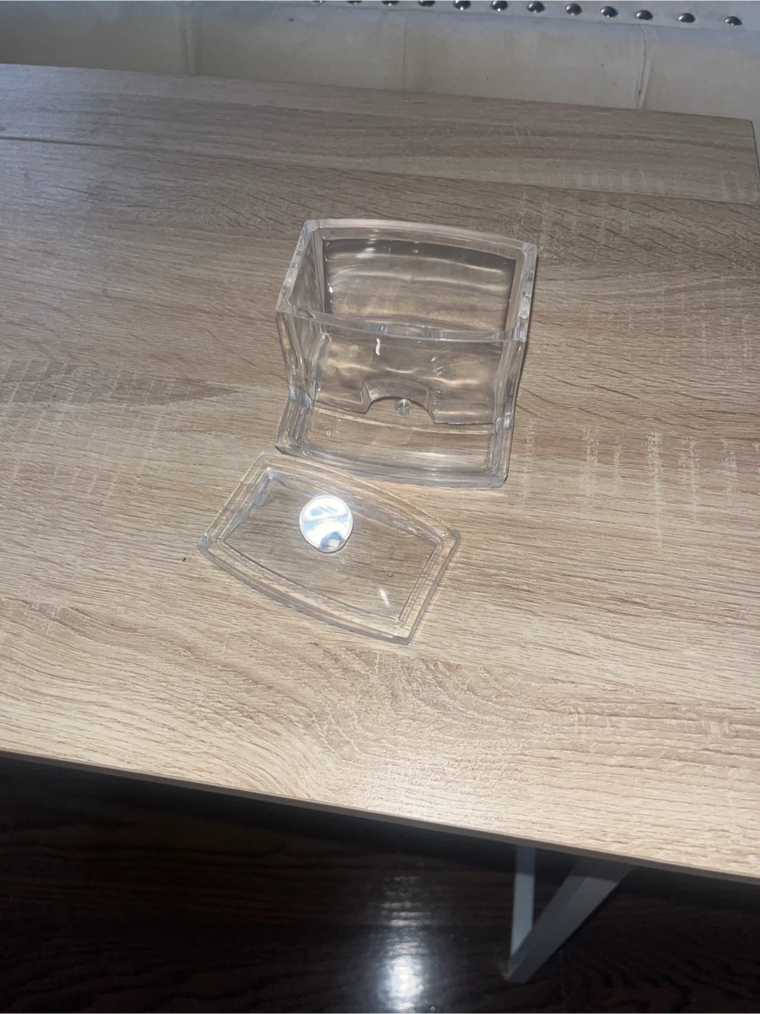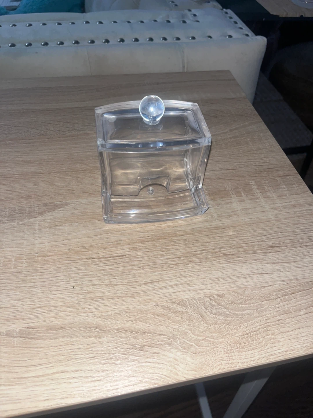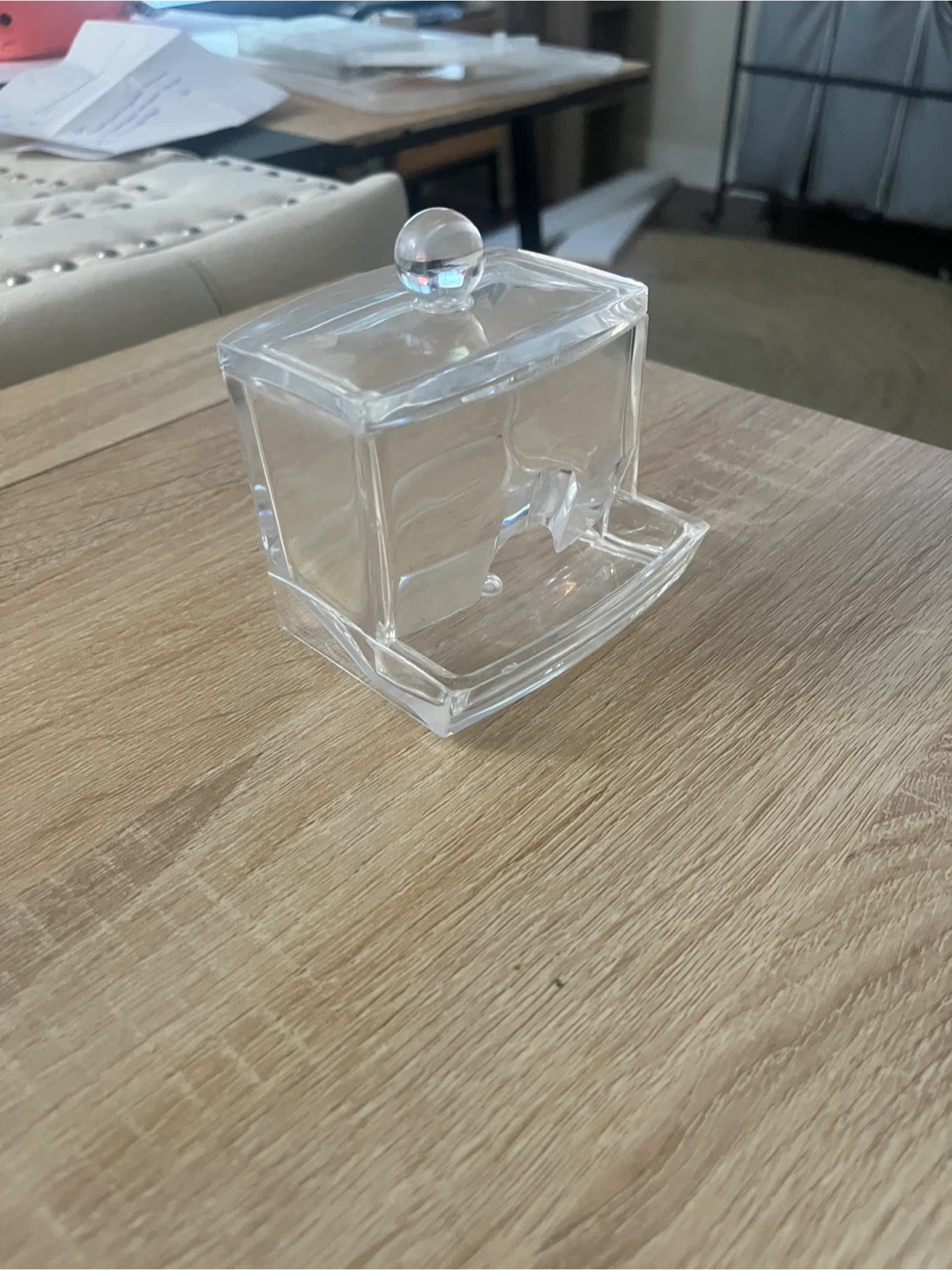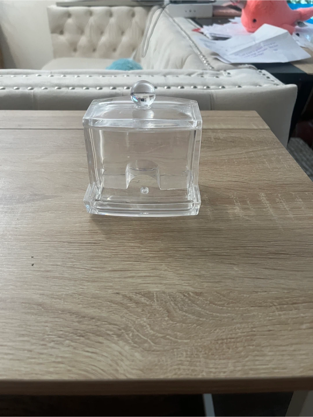 This clear acrylic container is perfect for storing cotton swabs or cotton balls. It features a convenient lid with a small knob for easy access. Its compact design makes it ideal for vanities or bathrooms. Acrylic material.