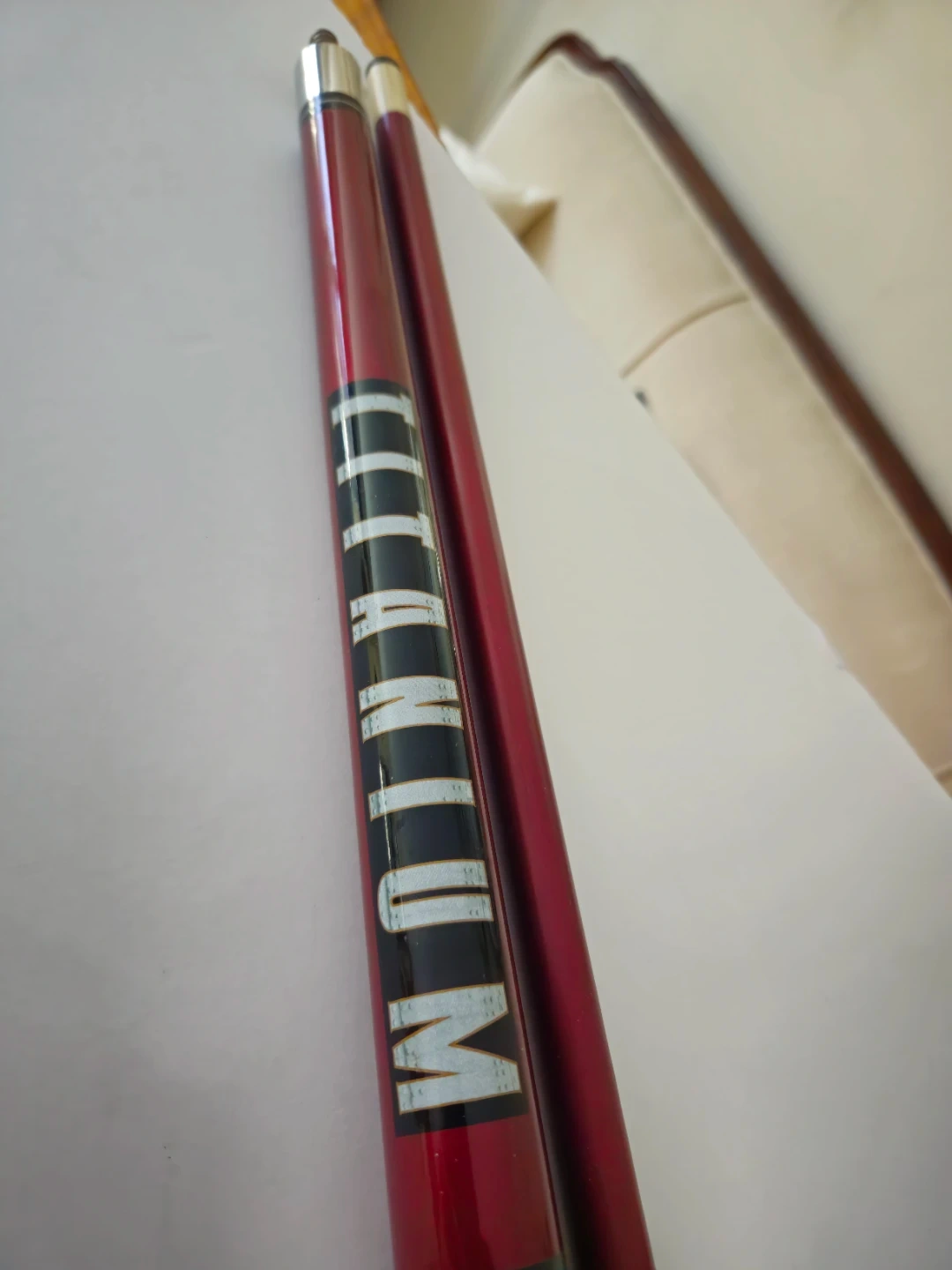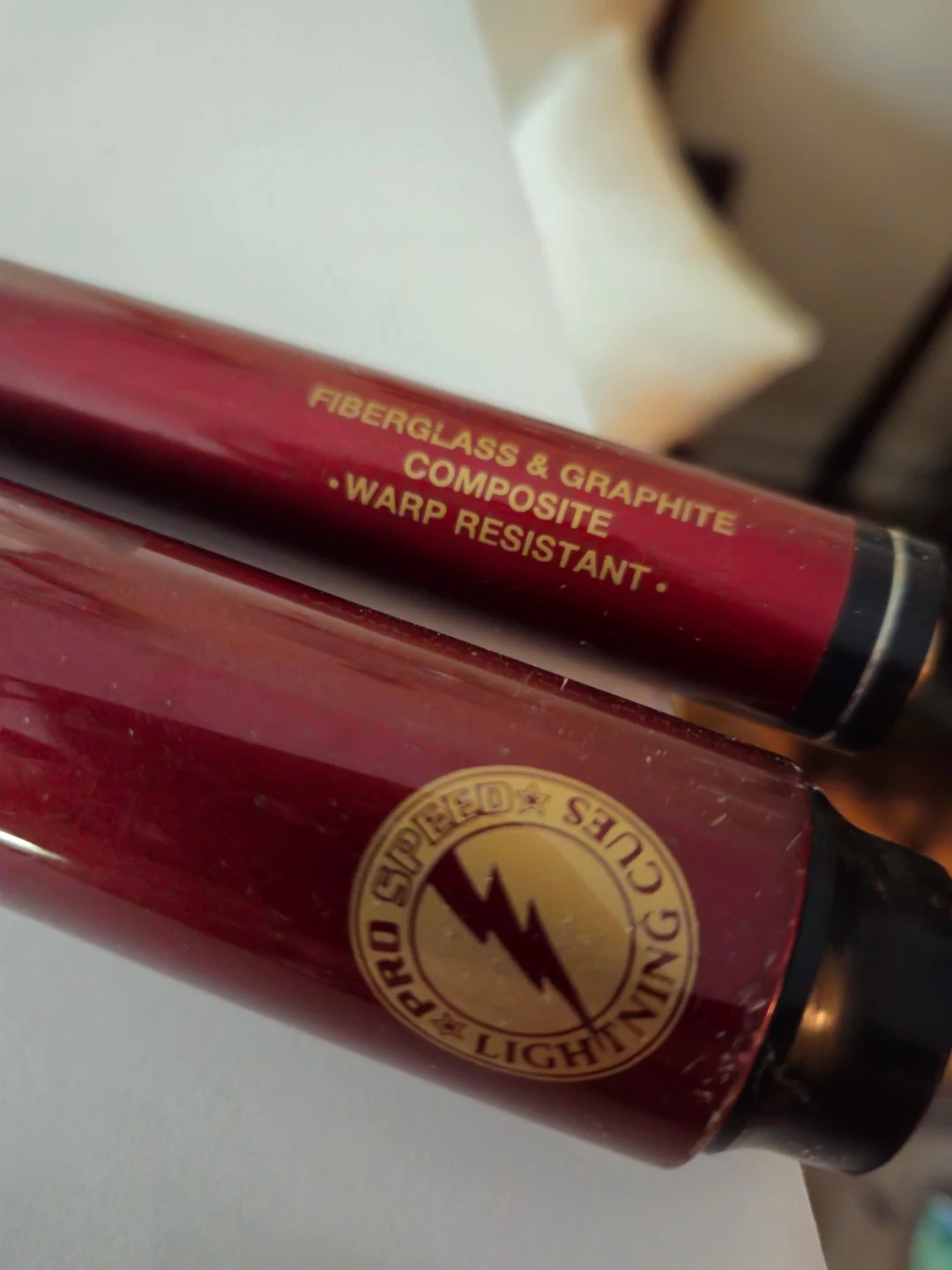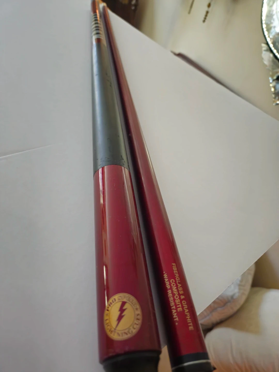 This is a Pro Speed Lightning Cues pool cue stick. It's made from a fiberglass and graphite composite that's warp resistant. This cue is suitable for playing pool.