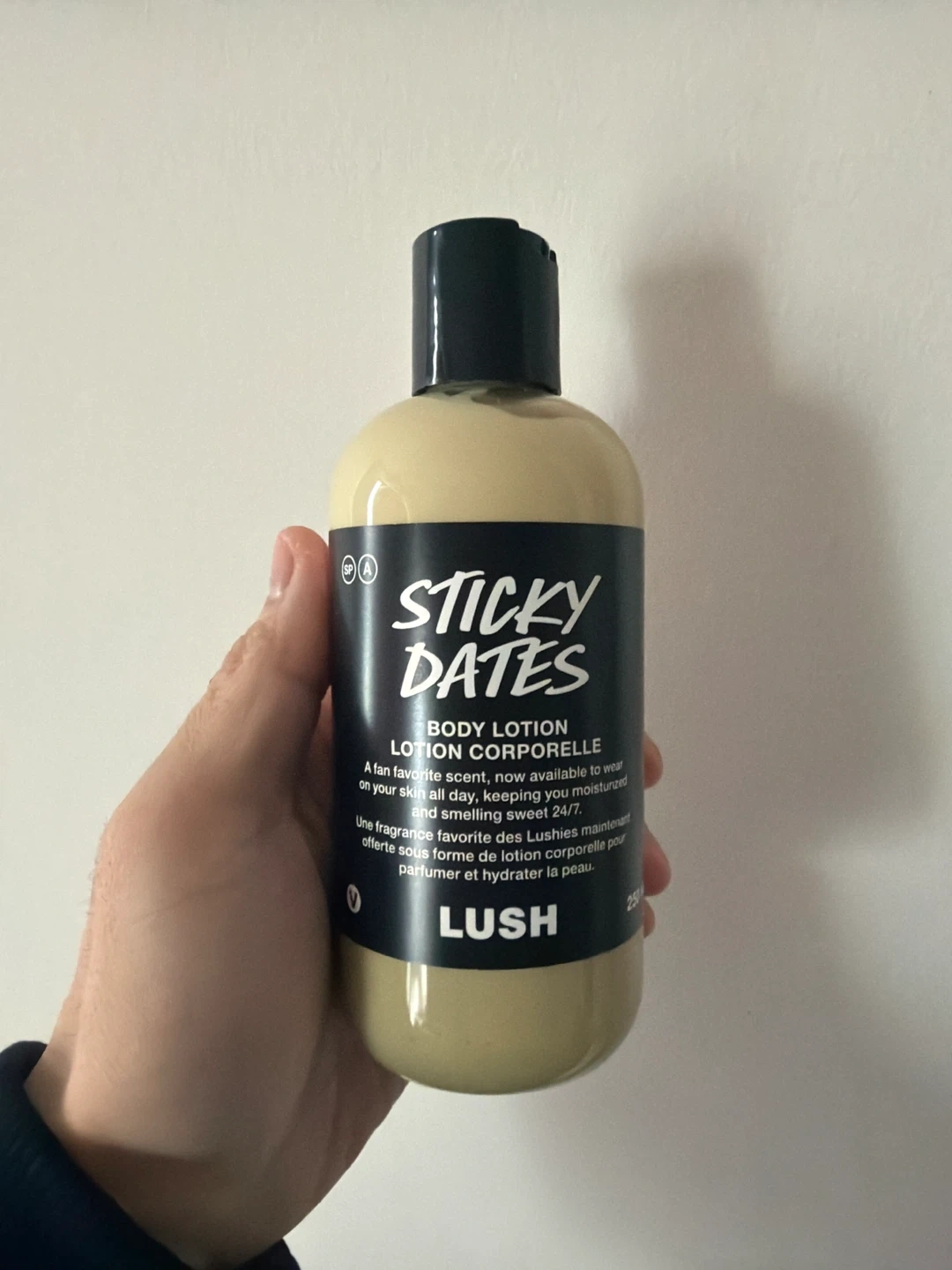 This is the LUSH Sticky Dates Body Lotion. It's a fan favourite scent, now available to wear on your skin. It keeps you moisturized and smelling sweet 24/7. This lotion is 250ml.