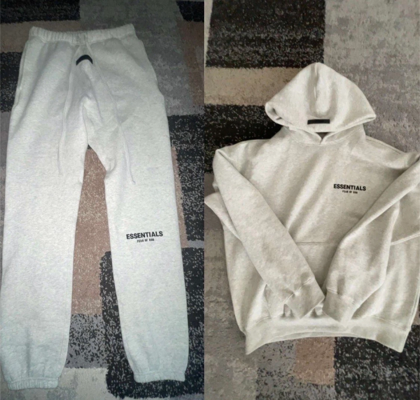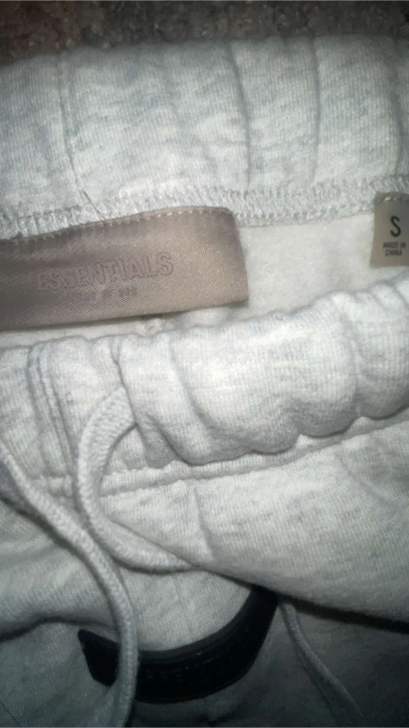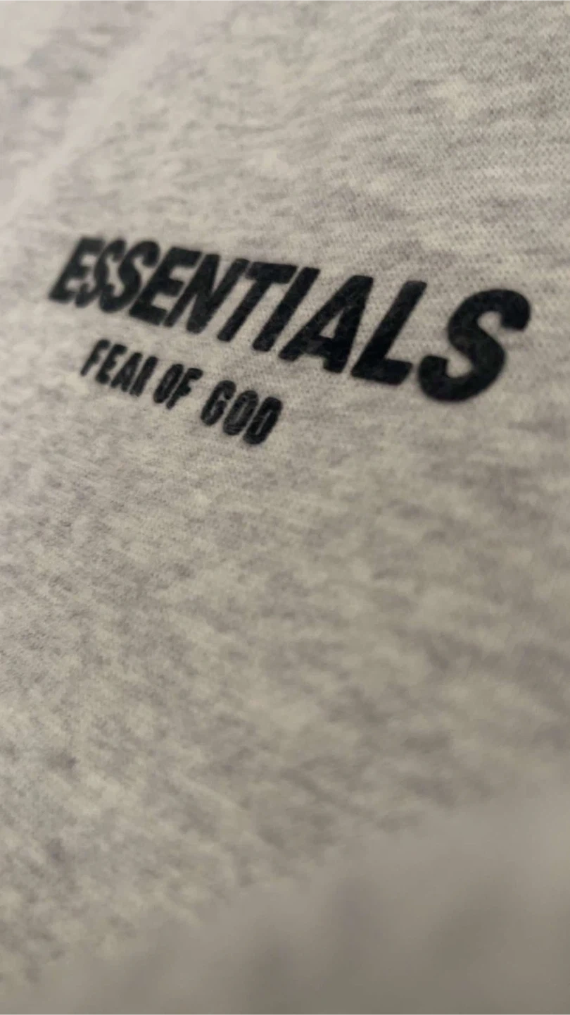 This is a matching set from Fear of God Essentials, including a hoodie and sweatpants. Both pieces are a light grey heathered colour and made from a comfortable fleece material. Perfect for casual wear, these pieces offer a relaxed fit and the brand's signature minimalist style. BRAND NEW SIZE SMALL TO MEDIUM DM FOR AUESTIONS ONLY IF SRS
