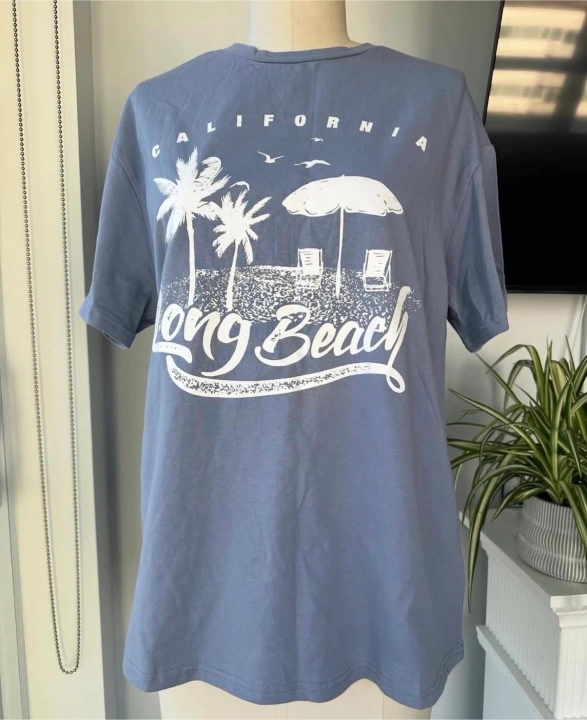 A comfy t-shirt with a "California Long Beach" graphic featuring palm trees and a beach umbrella. It's a short-sleeved, crew neck style. This shirt is great for casual wear.