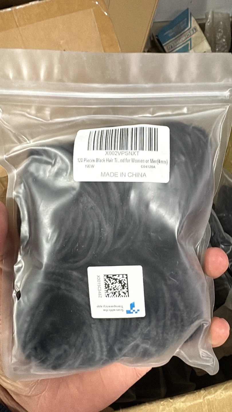 120 black hair ties are included. They are 4mm in width and suitable for women or men. Made in China.